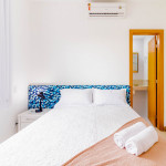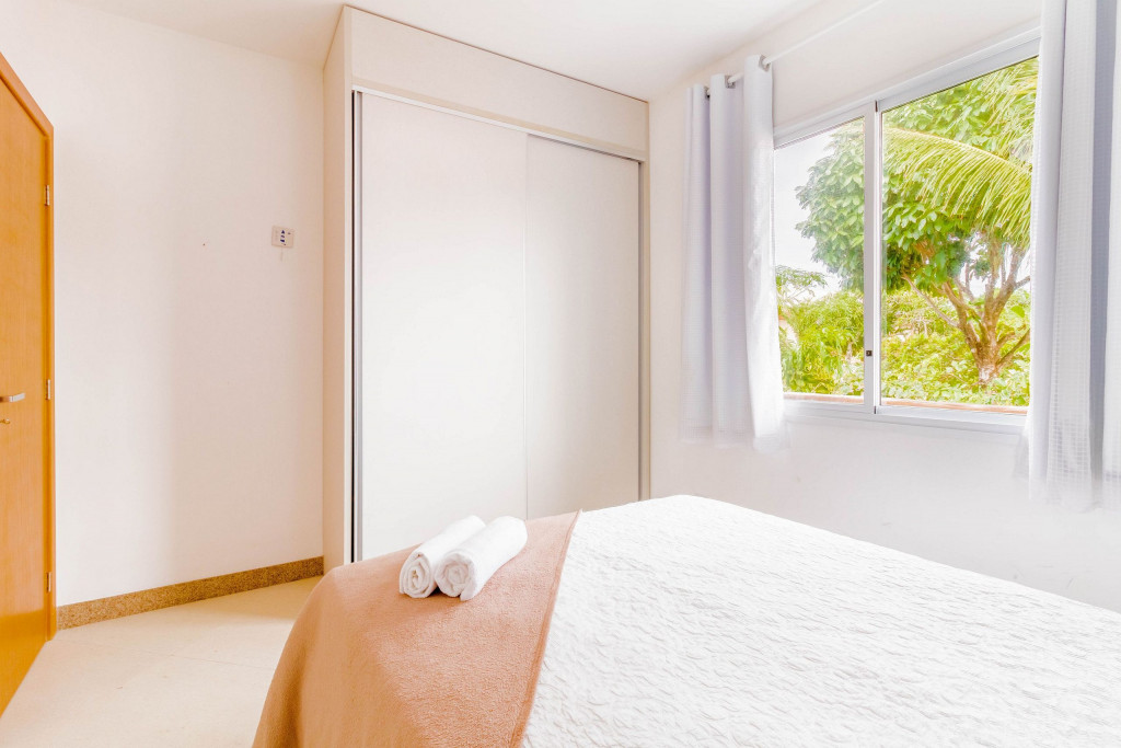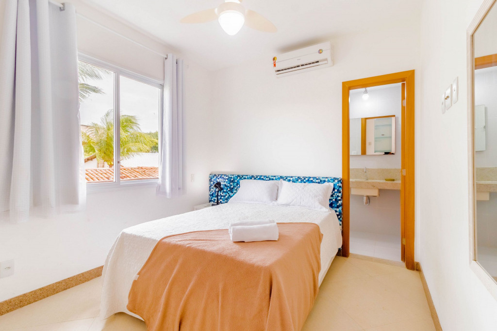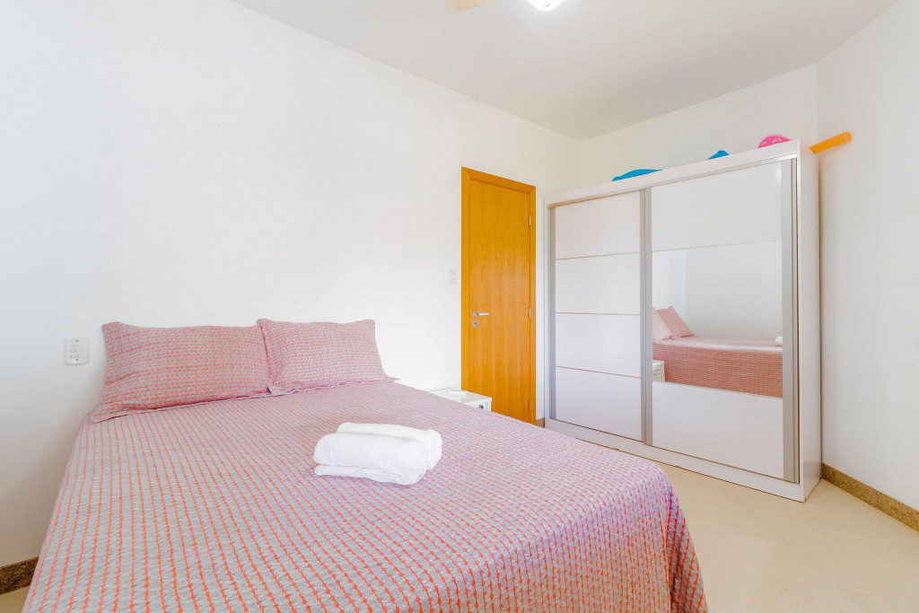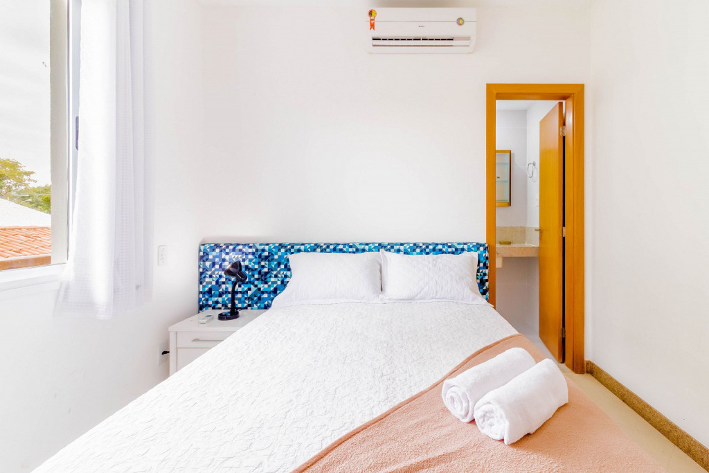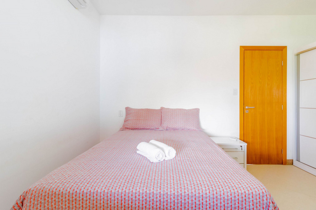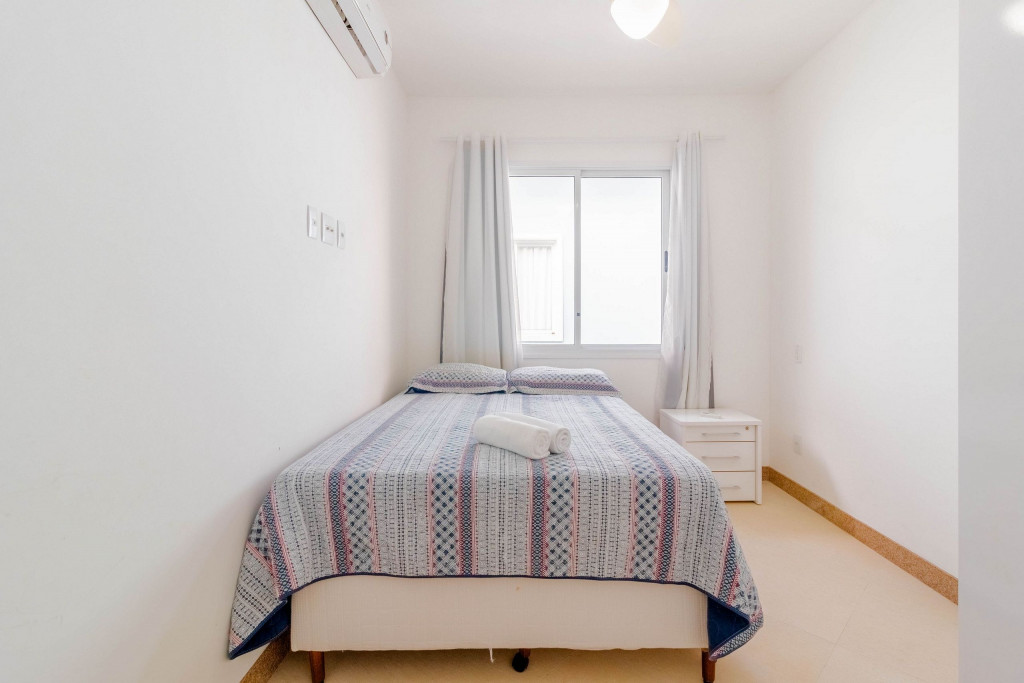 A composição dos quartos é da seguinte forma:Suíte 1: 1 cama casal, ar condicionado tipo split, armário e cortina blackout;Suíte 2: 1 cama casal com auxiliar de solteiro, ar condicionado tipo split, armário, cortina blackout e ventilador;Quarto 1: 1 cama casal, ar condicionado tipo split, armário, cortina blackout e ventilador.