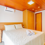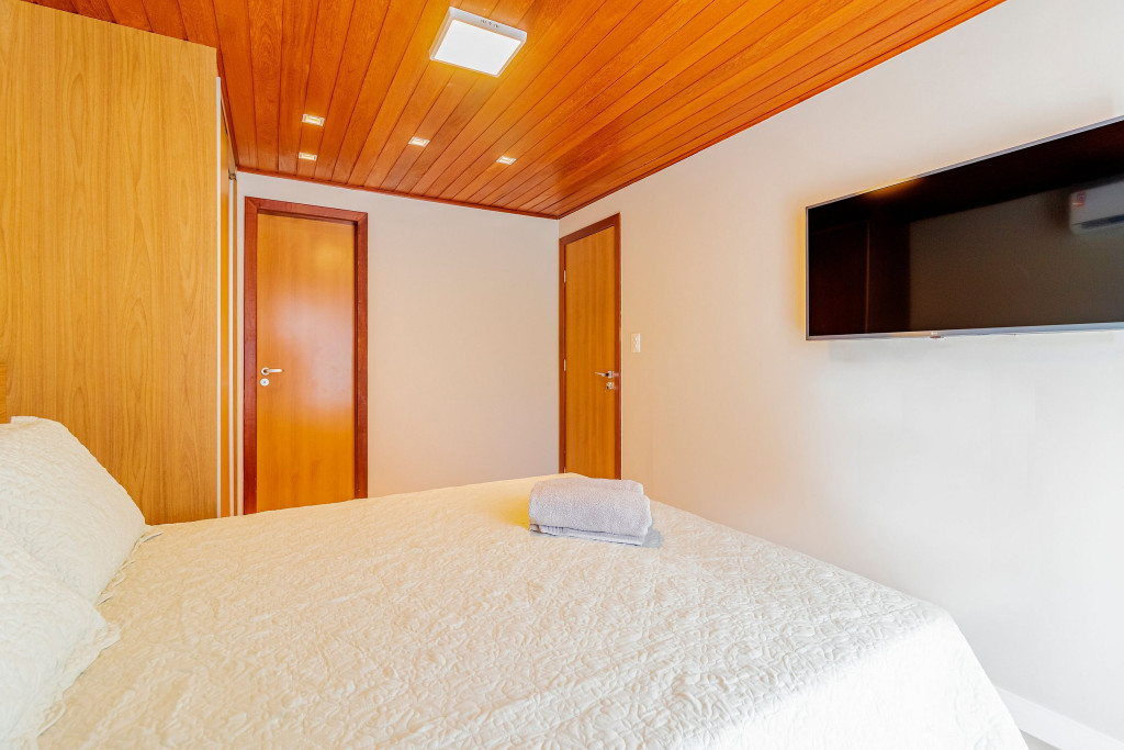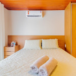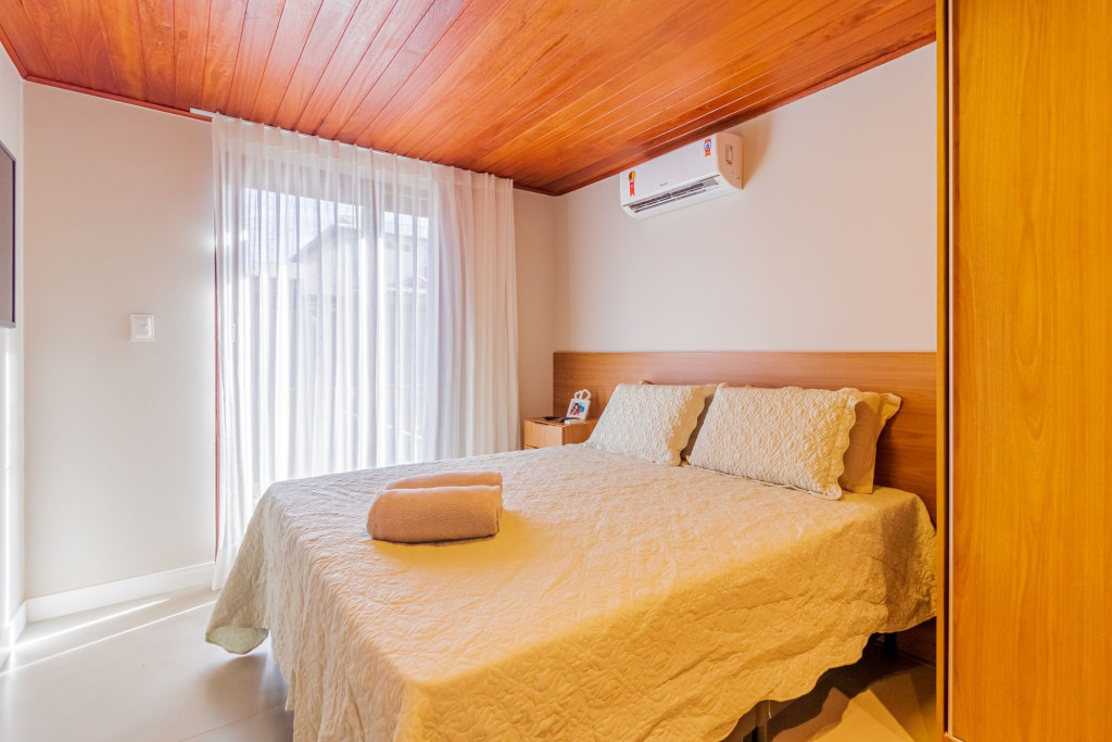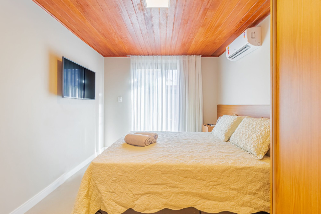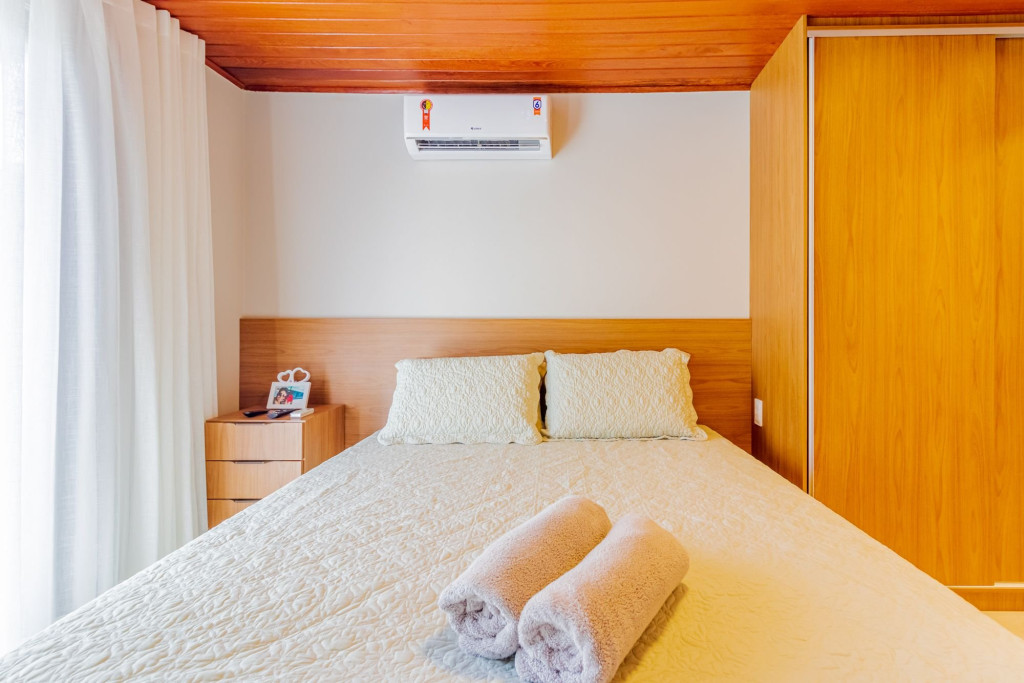 A composição dos quartos é da seguinte forma:Suíte 1: 1 cama queen, ar condicionado split, Smart Tv, cortina blackout e armário;Quarto 1: 1 cama casal, ar condicionado split, Smart Tv, cortina blackout e armário.