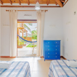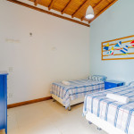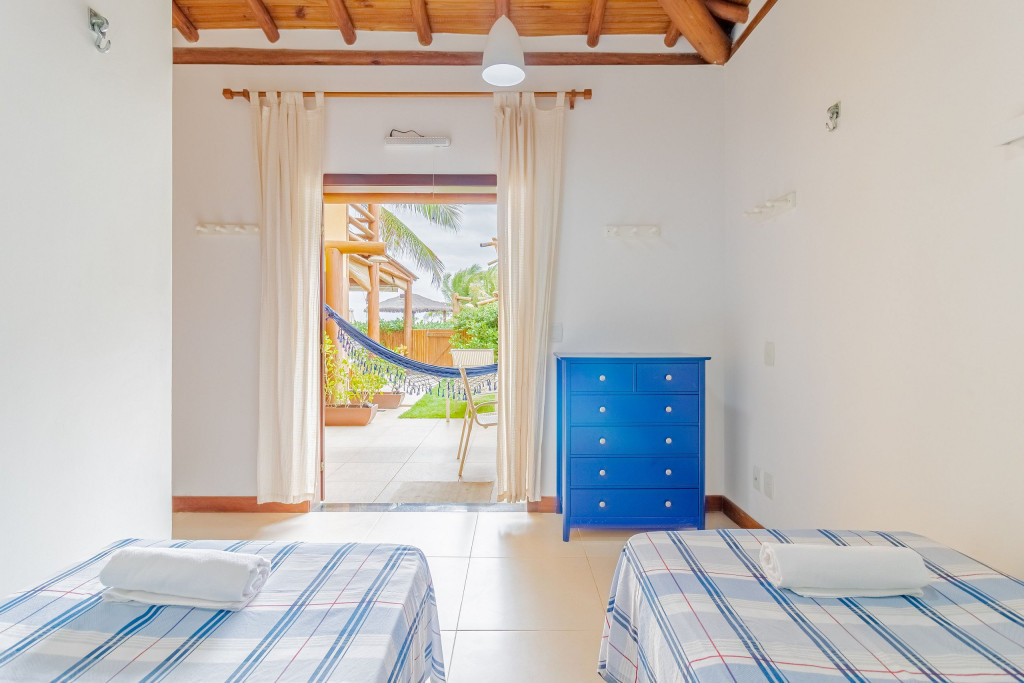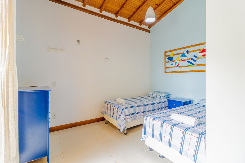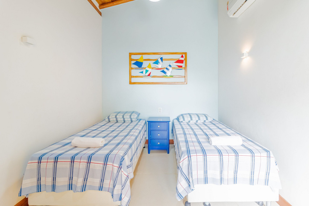 A composição dos quartos é da seguinte forma:Suíte 1 (Térreo): 2 bicamas, ar condicionado split e cortina blackout;Suíte 2 (Superior): 1 cama queen, ar condicionado split, cortina blackout e armário;Suíte 3 (Superior): 1 bicama, 1 beliche, 1 colchão solteiro e ar condicionado split.