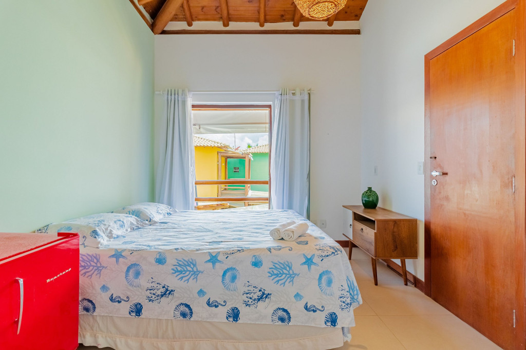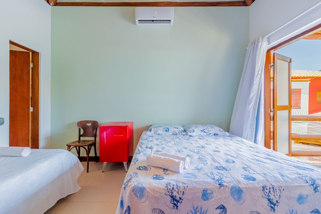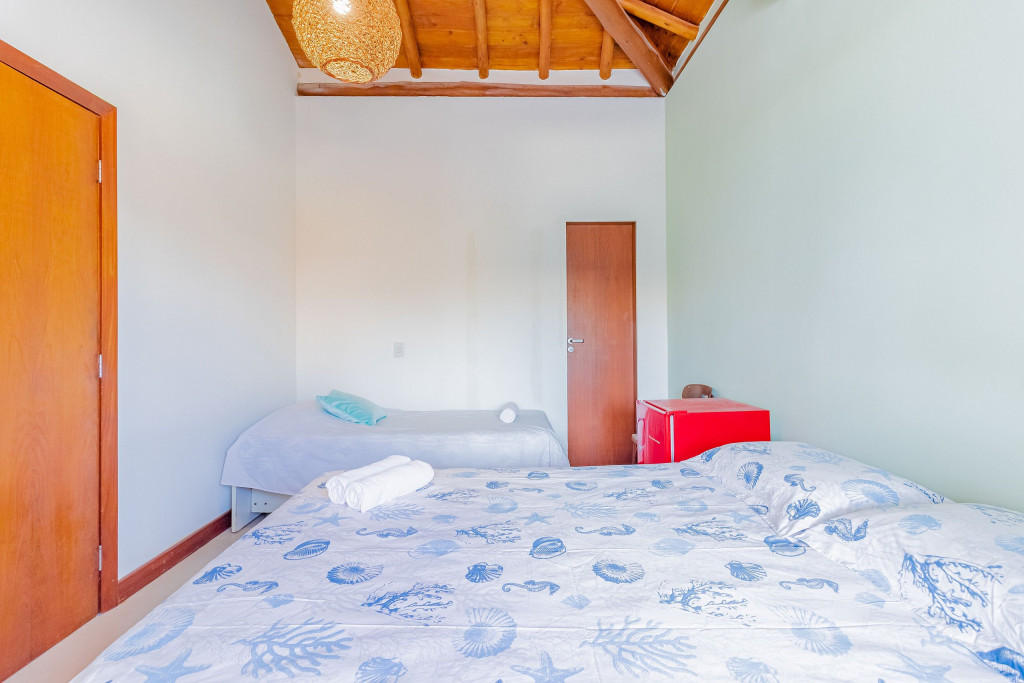 A composição dos quartos é da seguinte forma:Suíte 1 (Térreo): 1 cama casal, ar condicionado split e armário;Suíte 2 (Superior): 1 cama queen, 1 bicama, ar condicionado split, cortina blackout e frigobar;Quarto 1 (Superior): 1 cama casal, ar condicionado split, cortina blackout e armário.