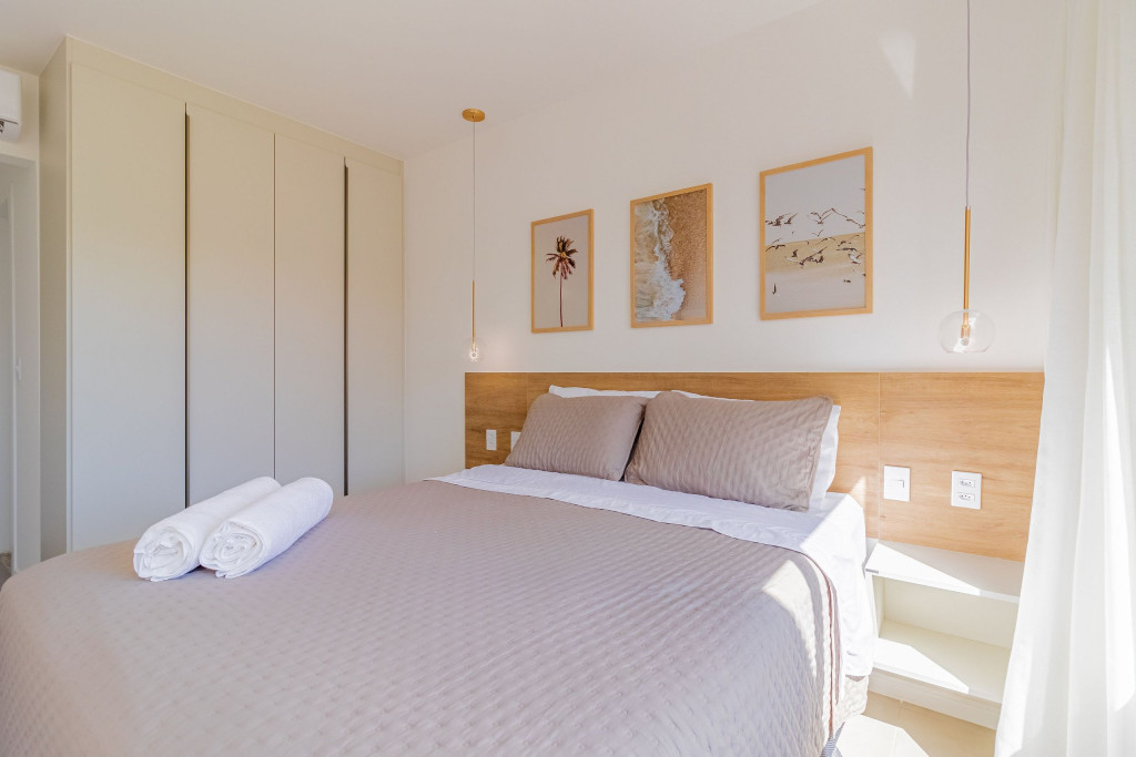 A composição dos quartos é da seguinte forma:Suíte 1: 1 cama queen, 2 camas auxiliares solteiro, ar condicionado, cortina blackout e armário;
