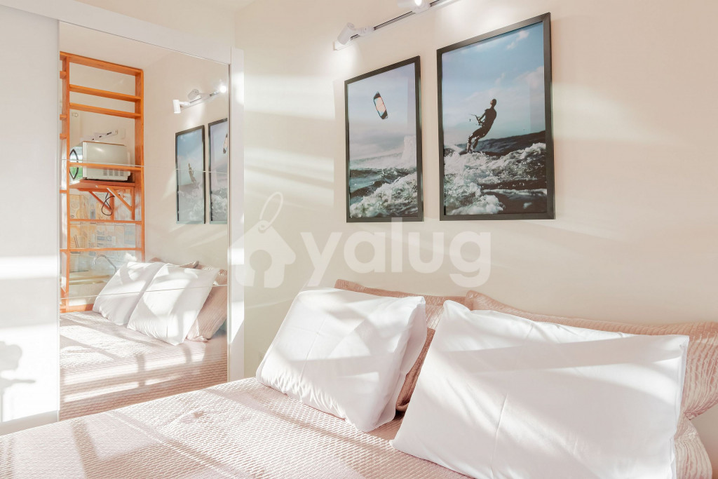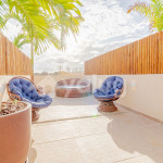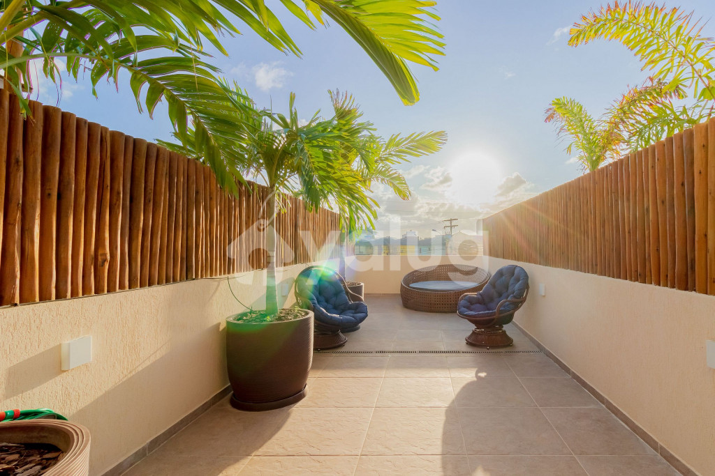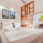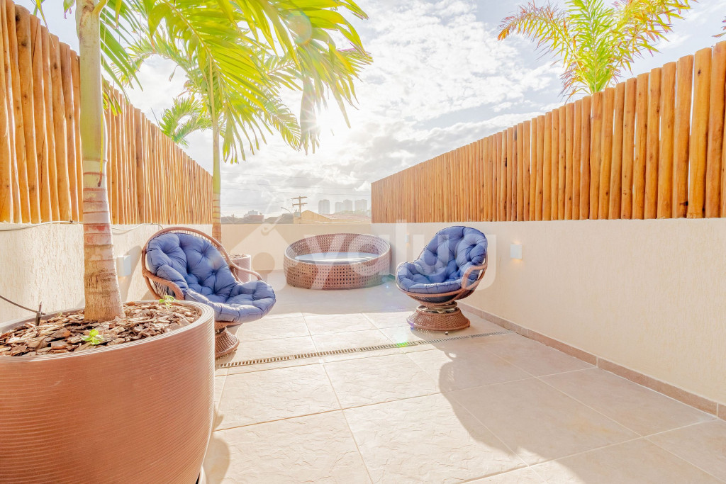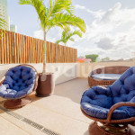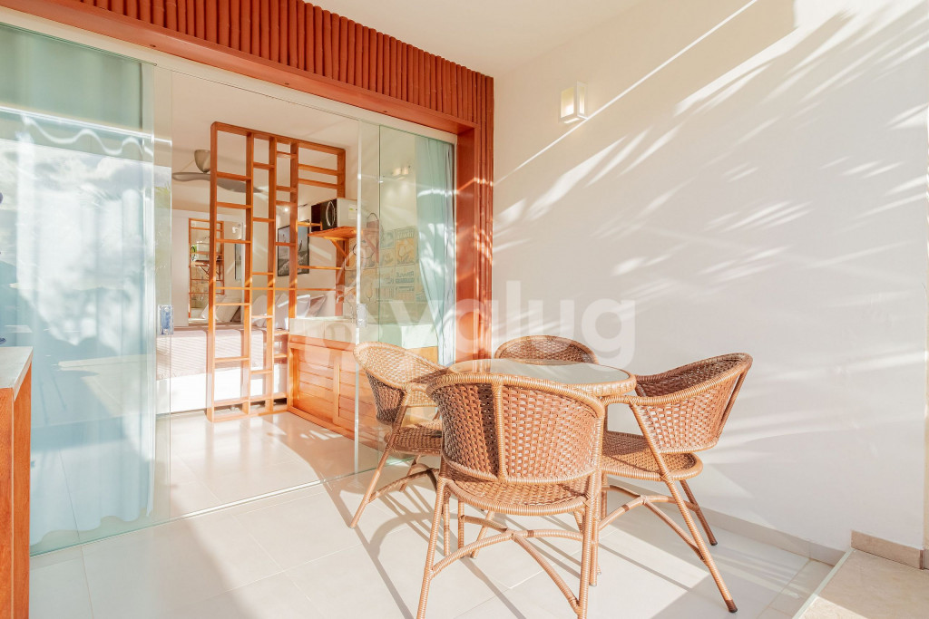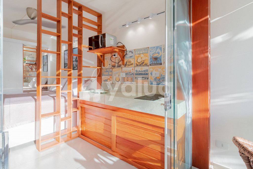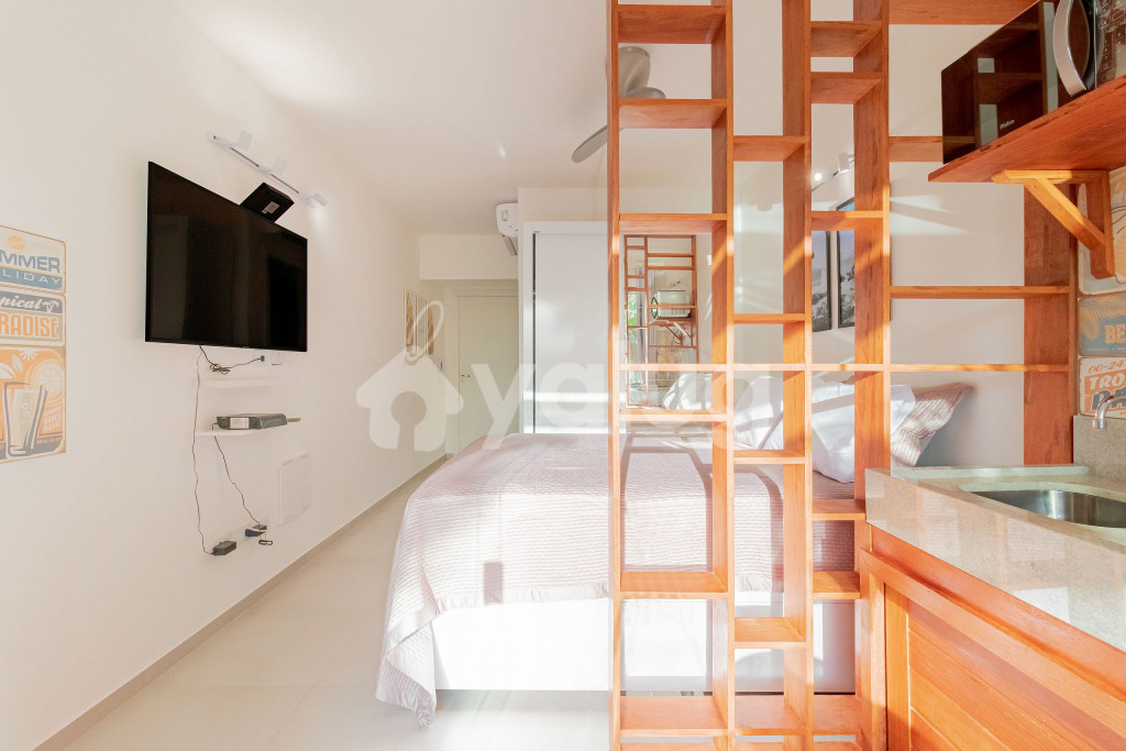 Meu espaço é composto por uma 1 suíte com ar condicionado e TV, cozinha completa e varanda com mesa e puffs para relaxar.