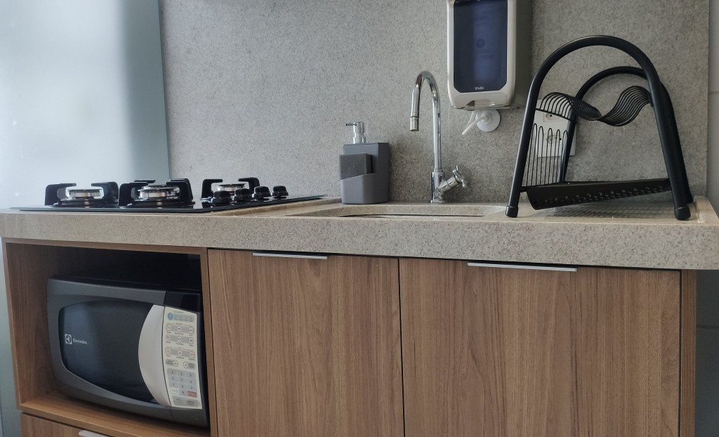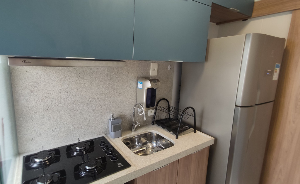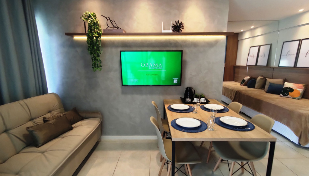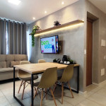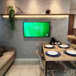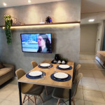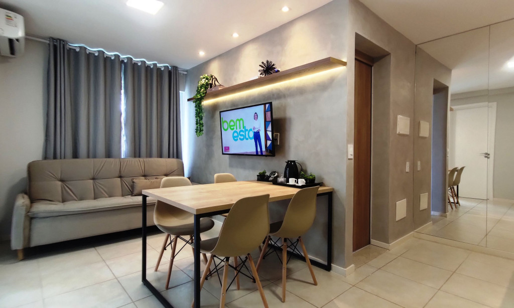 Apartamento moderno e aconchegante para até sete hóspedes.A suíte com um banheiro reversível e acesso a varanda é composta de uma confortável cama casal e uma bicama solteiro, além de Armário, TV Smart, Ar-condicionado e cortinas blackout.Na sala com varanda, o hóspede tem a disposição um sofá-cama com TV, mesa de jantar e uma cama solteiro com bicama. E para um maior conforto, Ar-condicionado e cortinas blackout.Cozinha equipada com cooktop, geladeira, micro-ondas, liquidificador, sanduicheira, louças, copos, talheres e panelas para que você possa fazer suas refeições com tranquilidade. Além de purificador de água, sem a necessidade de se comprar galão de água mineral.A lavanderia conta com uma máquina de lavar roupa, varal e ferro de passar.Disponibilizamos um enxoval de cama e banho, além de Wi-Fi e uma vaga de garagem gratuitas.Estão liberados acesso a piscina e churrasqueira.O apartamento possui uma vaga de garagem gratuita.