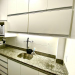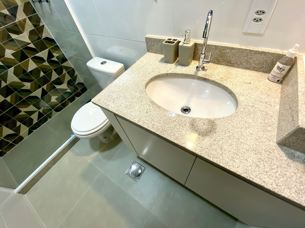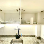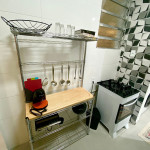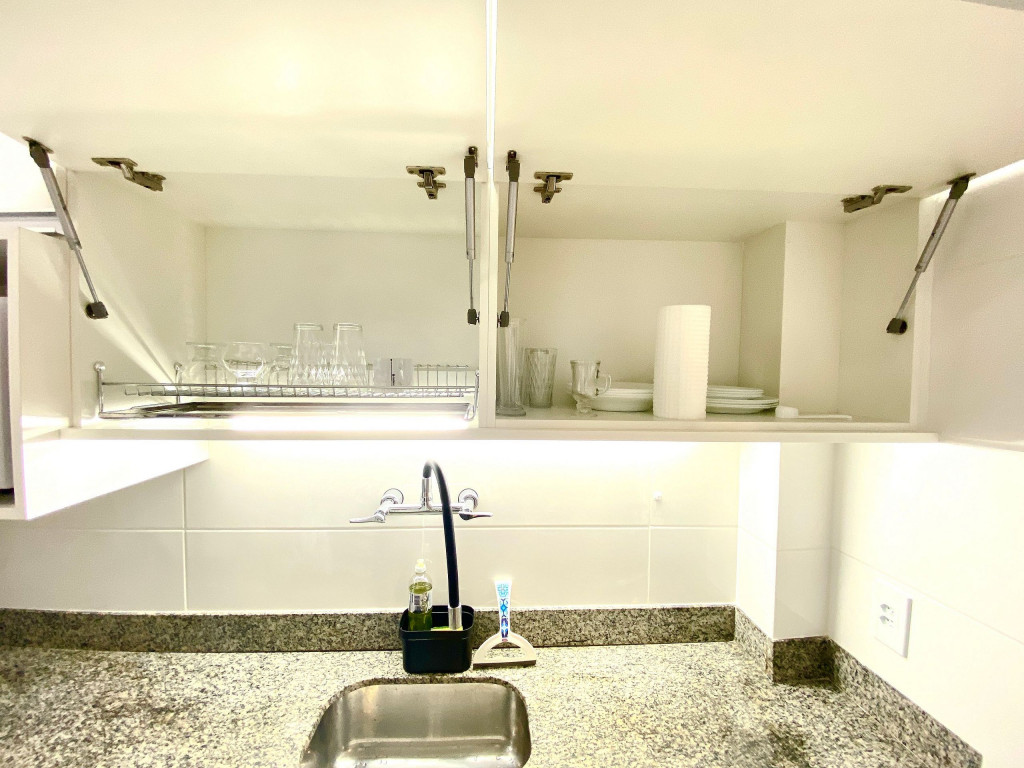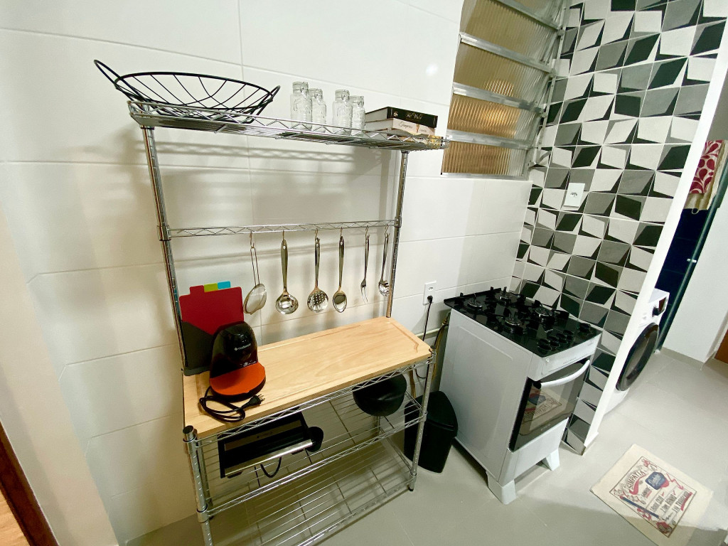 O apartamento é arejado e claro. O banheiro é pequeno e bem planejado, assim como a cozinha muito equipada e com bom suporte para quem gosta de cozinhar.