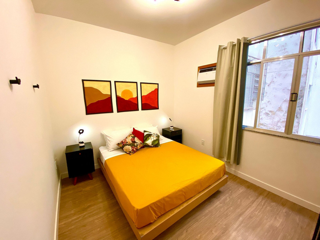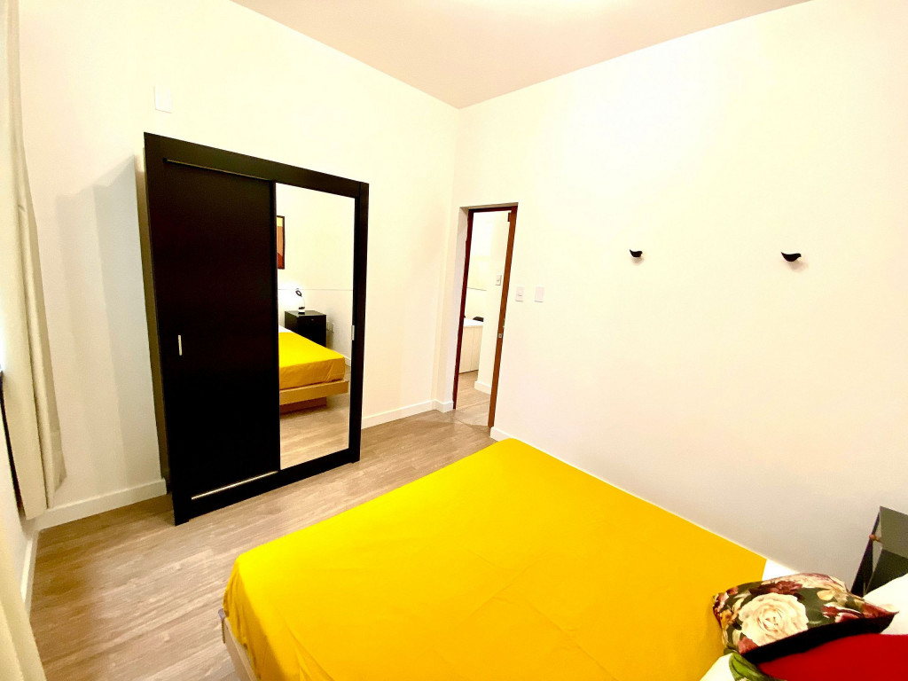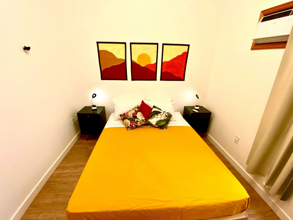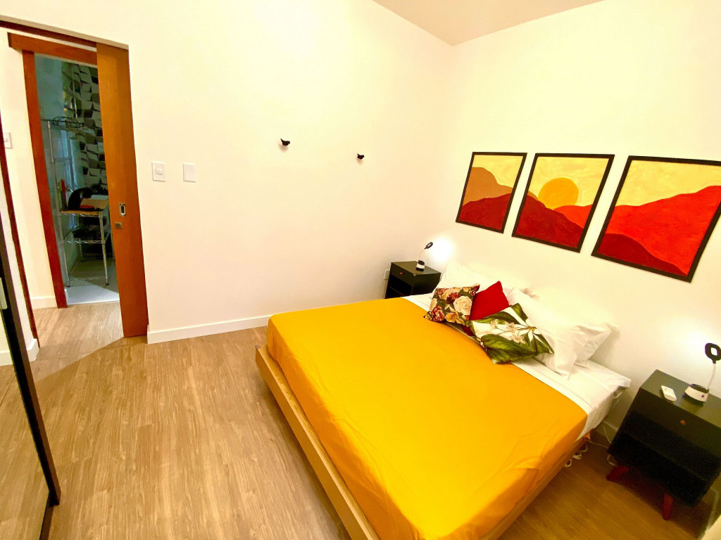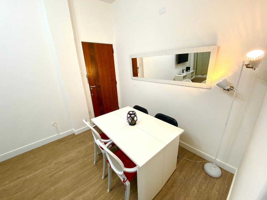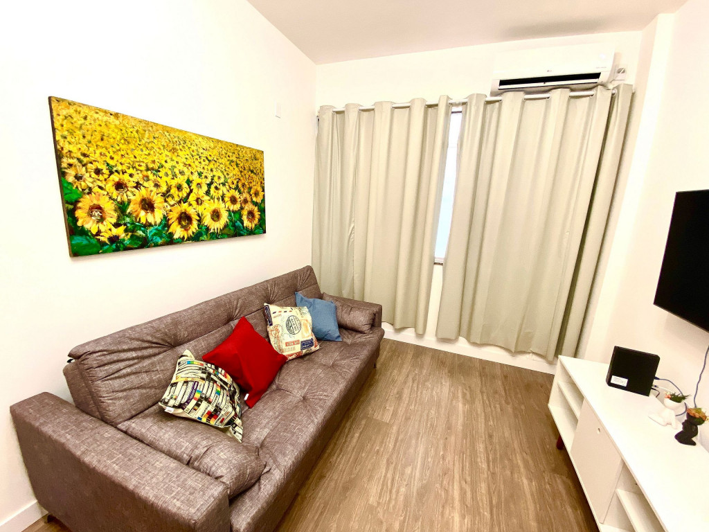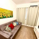 O apartamento tem um bom tamanho para um sala e quarto, aconchegante e silencioso, na sala temos uma mesa de jantar com 4 cadeiras dividindo o ambiente com a sala de estar com TV ( 55 ) e ar condicionado Split, uma decoração clean traz um tom muito acolhedor ao ambiente, o quarto com cama de casal e armário de 2 portas é claro e possui ar condicionado.