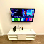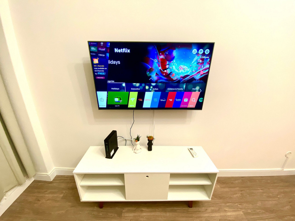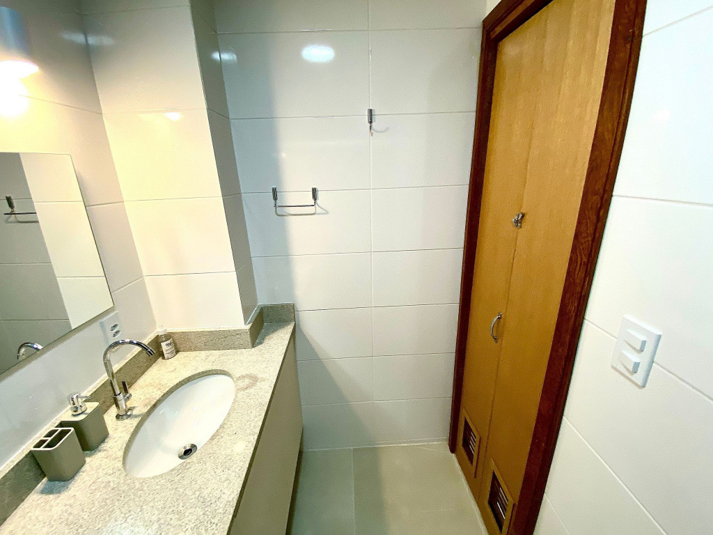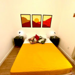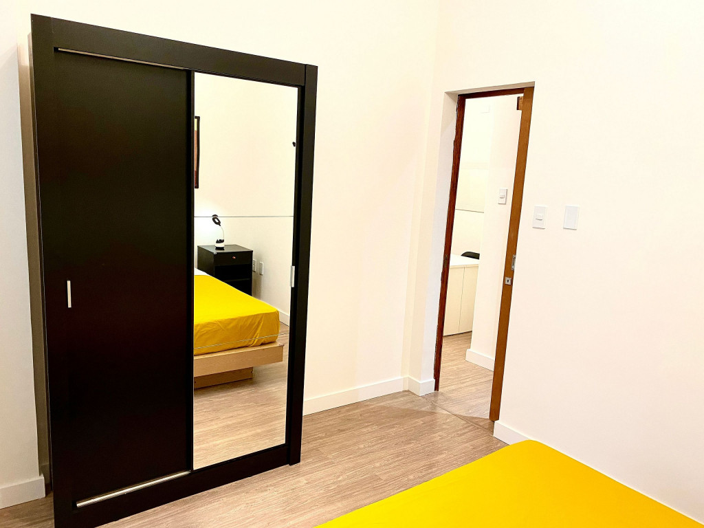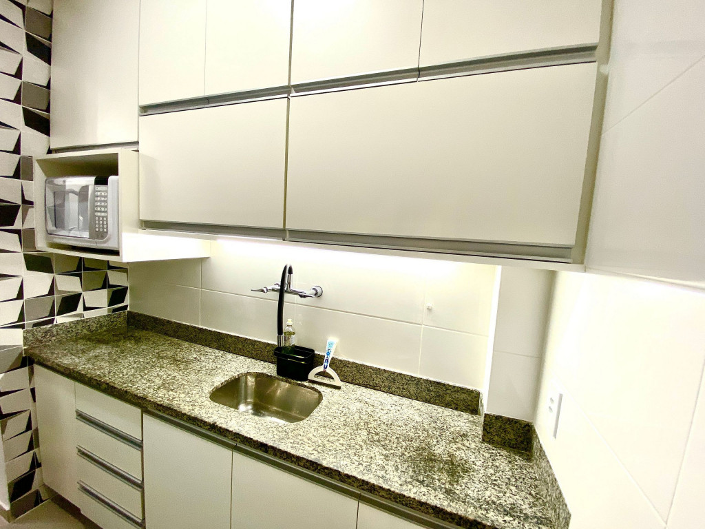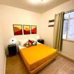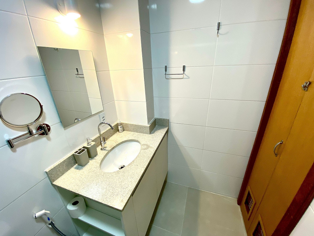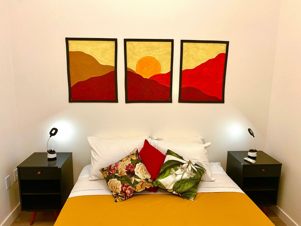 O apartamento tem um bom tamanho para um sala e quarto, aconchegante e silencioso, na sala temos uma mesa de jantar com 4 cadeiras dividindo o ambiente com a sala de estar com TV ( 55 ) e ar condicionado Split, uma decoração clean traz um tom muito acolhedor ao ambiente, o quarto com cama de casal e armário de 2 portas é claro e possui ar condicionado.