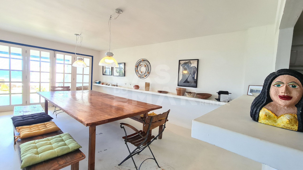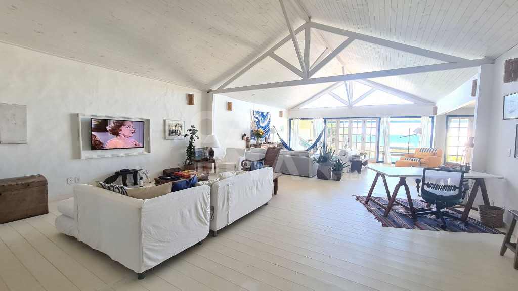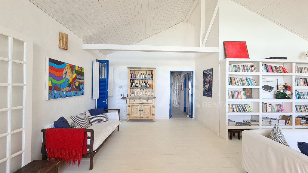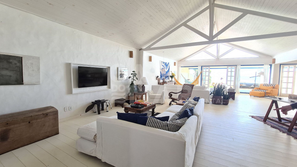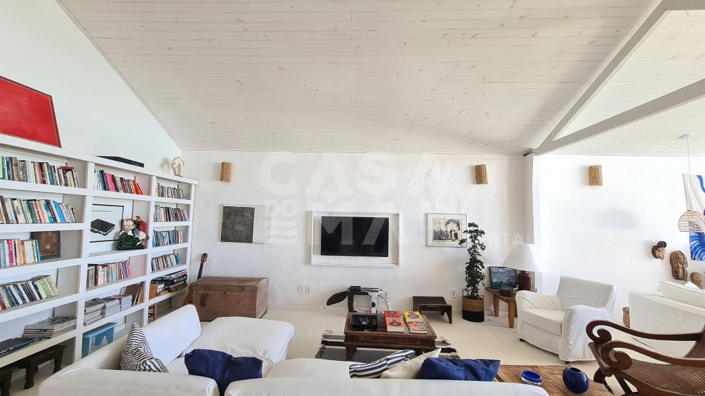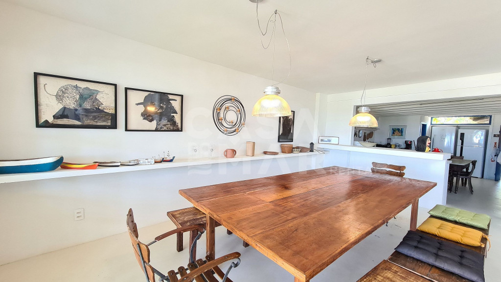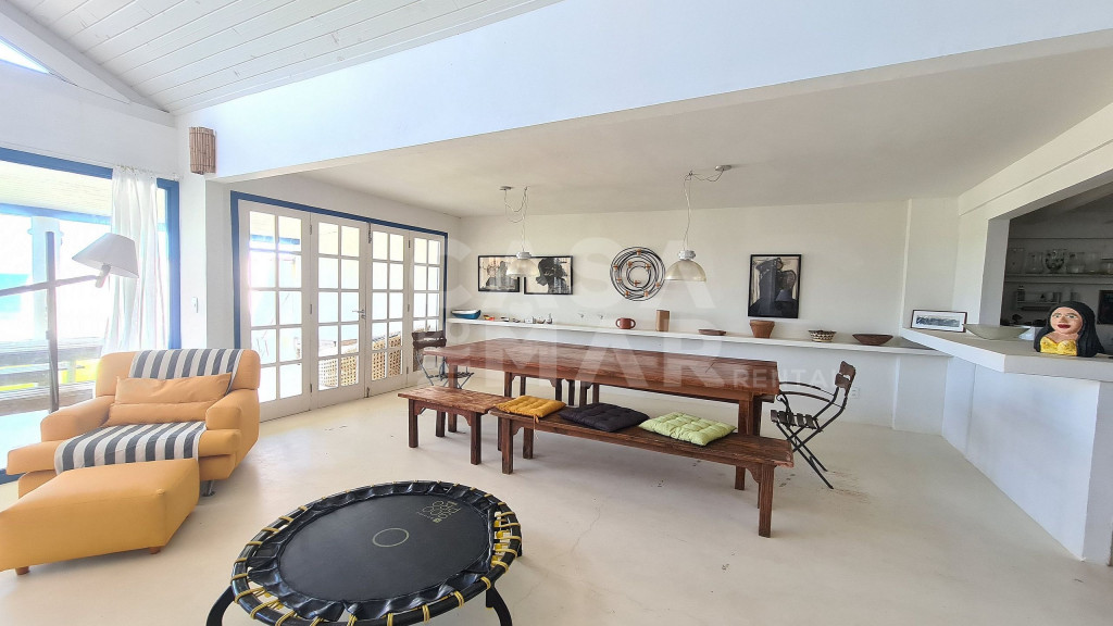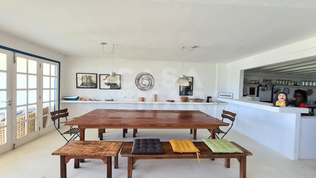 Sala espaçosa com 3 ambientes, cozinha integrada, 4 suítes e 1 quarto com banheiro para até 5 crianças, varanda de frente para o mar com mesa de jantar e terraço interno. Área de serviço. Vaga para dois carros.Ótima localização para quem deseja viajar com a família. Praia praticamente privativa, e muito tranquila para as crianças.Funcionárias servem petiscos e bebidas, e desenvolvem o cardápio com o Locatário.