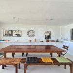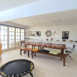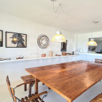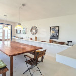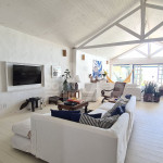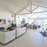 Uma sala ampla de estar, jantar e tv conjugadas em um ambiente com vista pro mar.