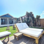 Garagem para 3 carros. Um deck com espreguiçadeiras, cadeiras e Umbrelone.