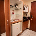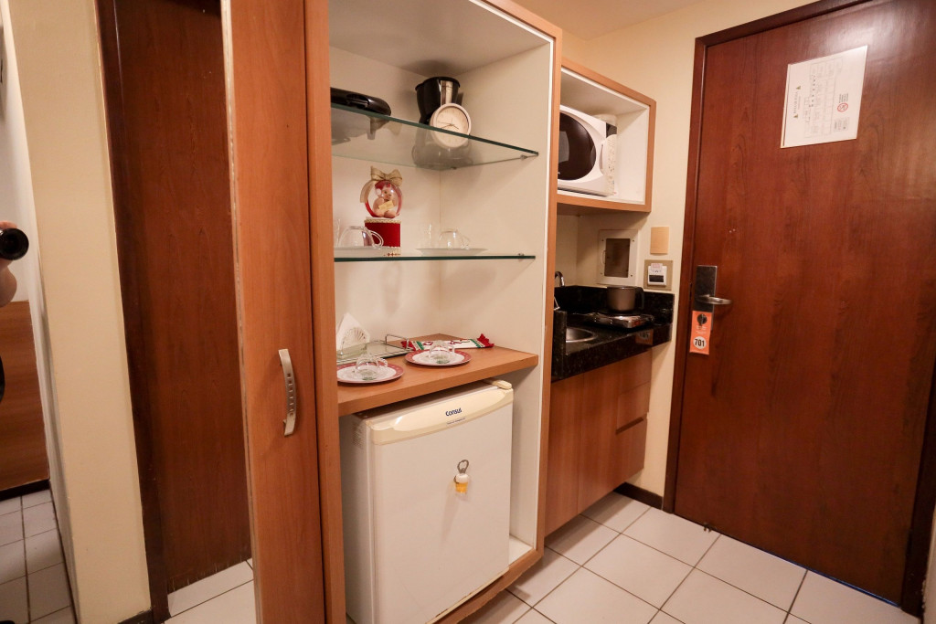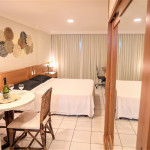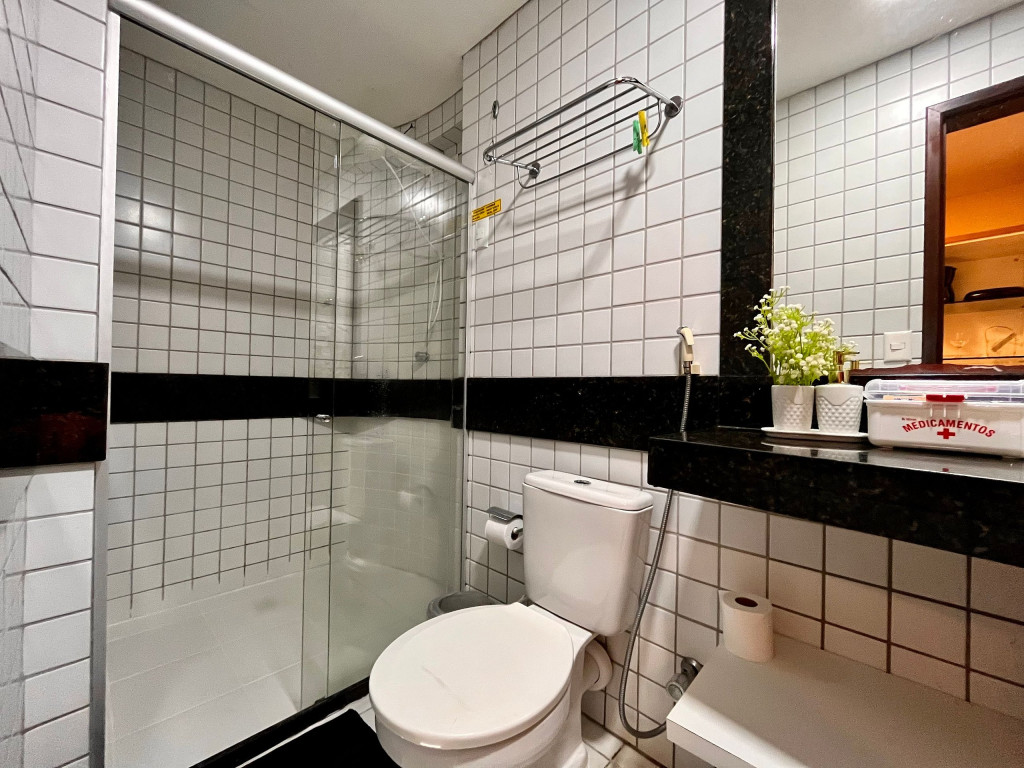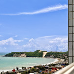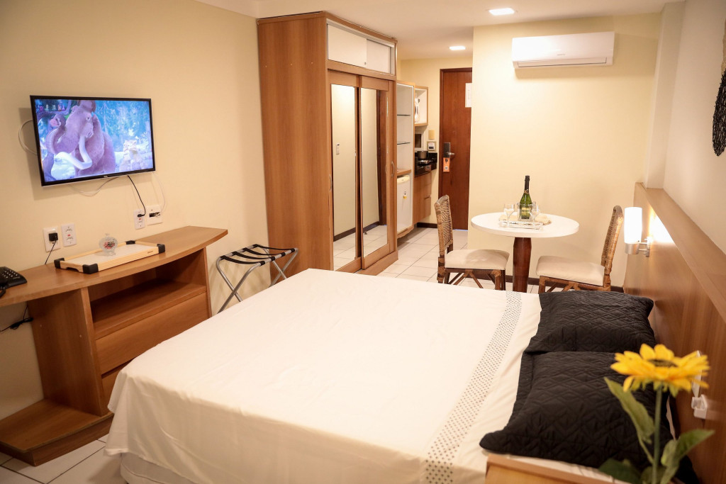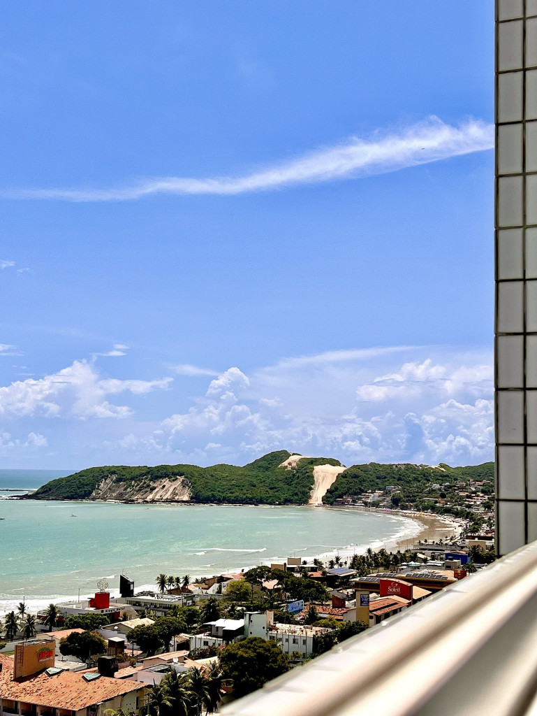 Flat em Ponta Negra/RN com piscina, estacionamento e recepção 24h. Quarto com cama Queen e sofá-cama, lençóis, toalhas, ar-condicionado, Smart TV e Wi-Fi. Cozinha completa: frigobar, micro-ondas, liquidificador, cafeteira, fogão (1 boca) e utensílios. Próximo a pontos turísticos.