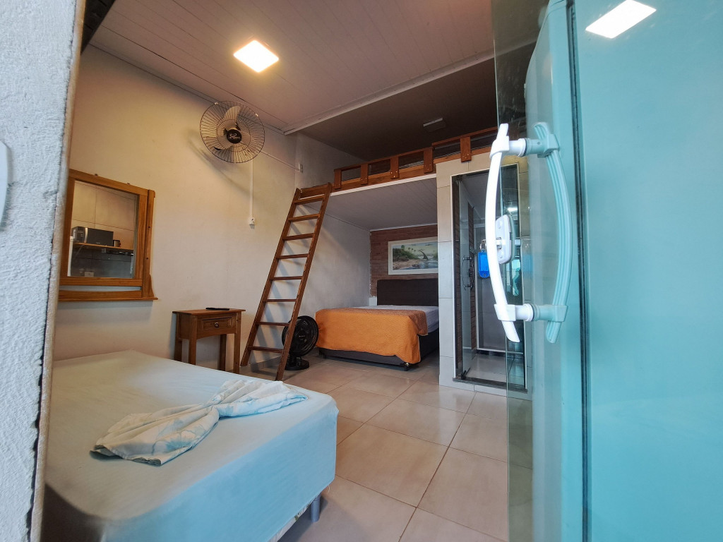 Cada suíte cabem no mínimo 5 pessoas, sendo uma cama de casal e colchões individuais num mezanino, recebendo assim uma família pequena com conforto numa súite.