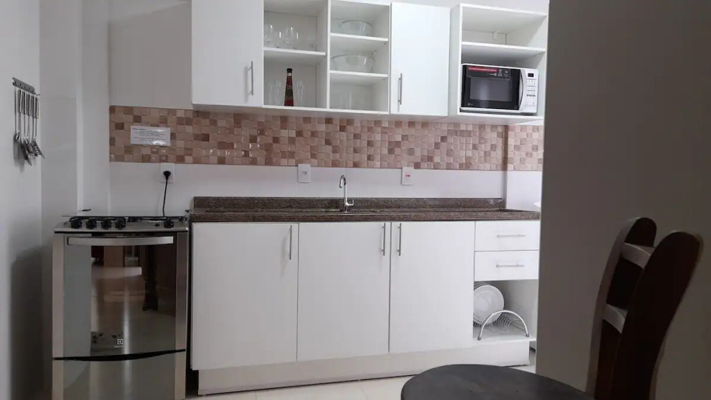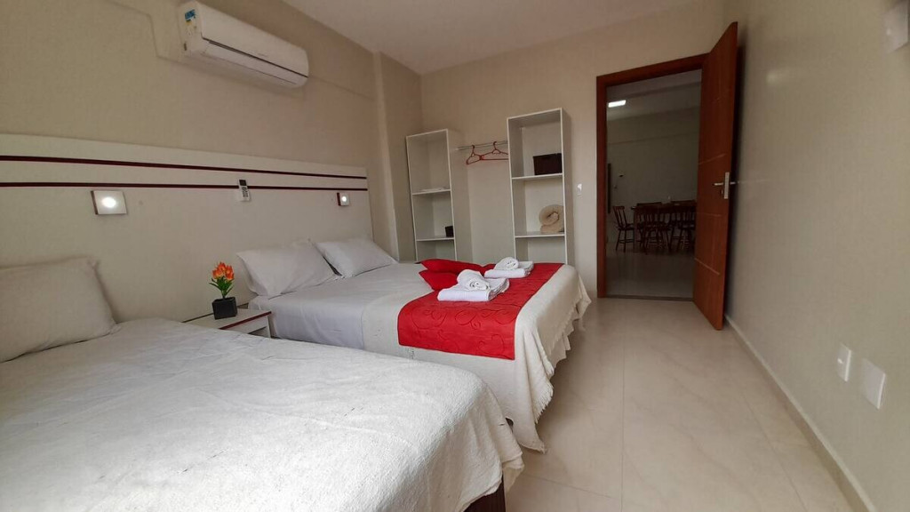 Nossa acomodação possui 2 quartos dispondo de cama de casal box, 1 cama de solteiro, em no outro quarto temos camas de junção de hotelaria ( pode ser utilizada como cama casal King ou 2 camas de solteiro) , ar condicionado. A cozinha possui todos os utensílios necessários para preparar e servir refeições com o conforto do lar. Conta também com micro-ondas, fogão geladeira e pia. A sala é integrada com a cozinha e dispõe de TV 43, e confortável sofá cama e (dorme 1 pessoa).