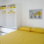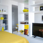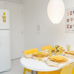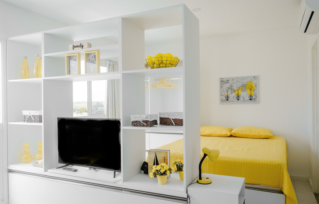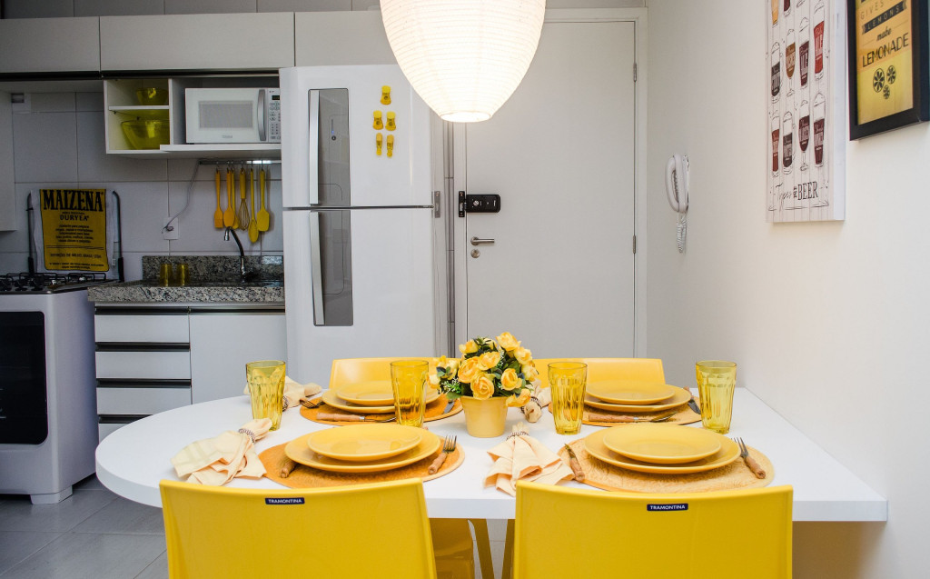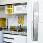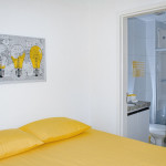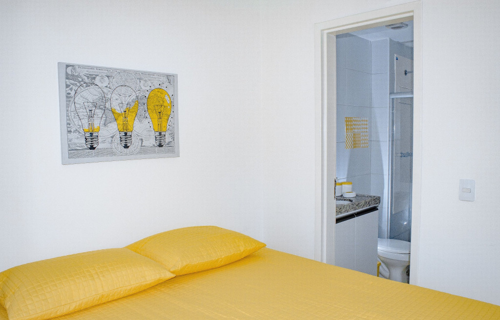 -Fechadura Eletrônica (Self-Checkin): maior comodidade para entrar no apartamento. -Internet com Wi-fi. -Sala: sofá-cama casal, mesa de jantar, cortina blackout, SmartTV com internet em móvel giratório separador de ambientes (você pode assistir do quarto ou da sala). -Quarto: cama de casal (Queen), guarda roupa, criado mudo, cortina blackout e ar condicionado. -Cozinha: fogão 4 bocas, micro-ondas, geladeira, sanduicheira, mesa dobrável, demais utensílios de cozinha: pratos, copos, talheres, liquidificador, cuscuzeira, etc. -Banheiro: box, espelho, chuveiro com água quente.