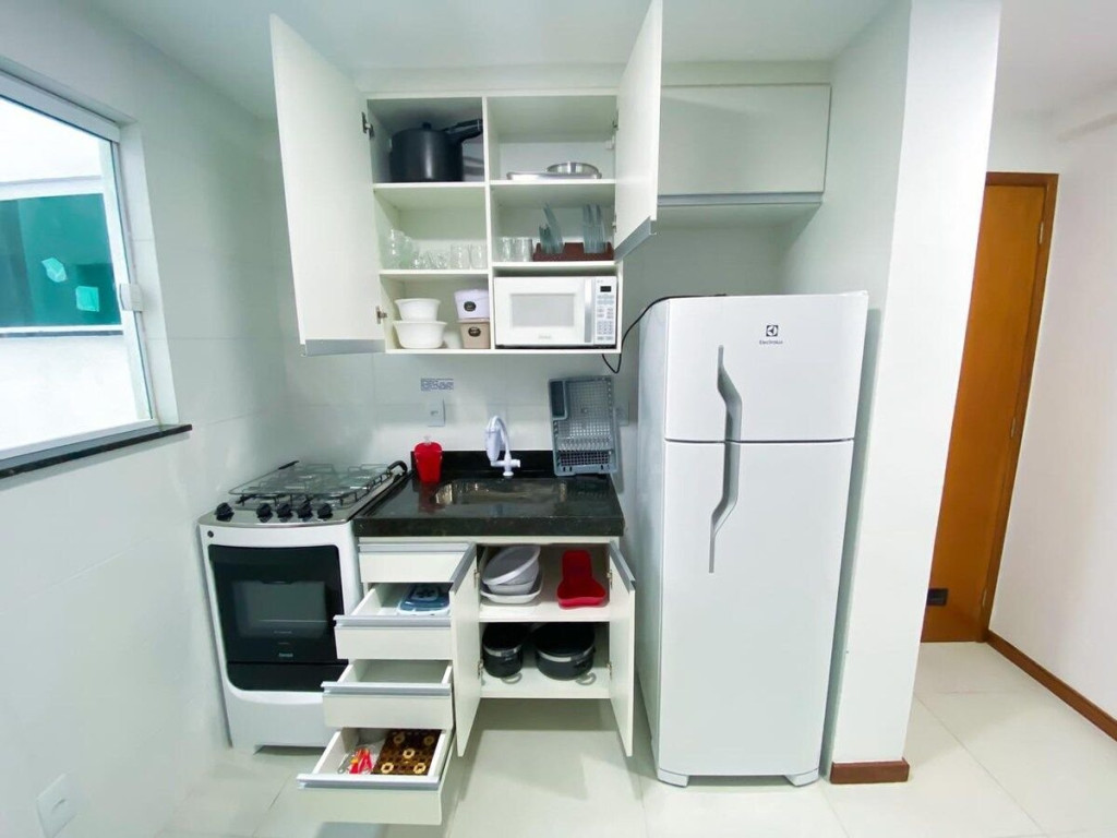 - Itens básicos de cozinha como louças, talheres, pratos, copos, vasilhas, panelas, panela de pressão