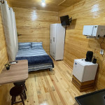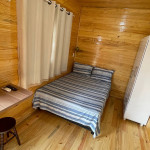 O Chalé contém cama casal, Tv, decoração rústica e banheiro completo.