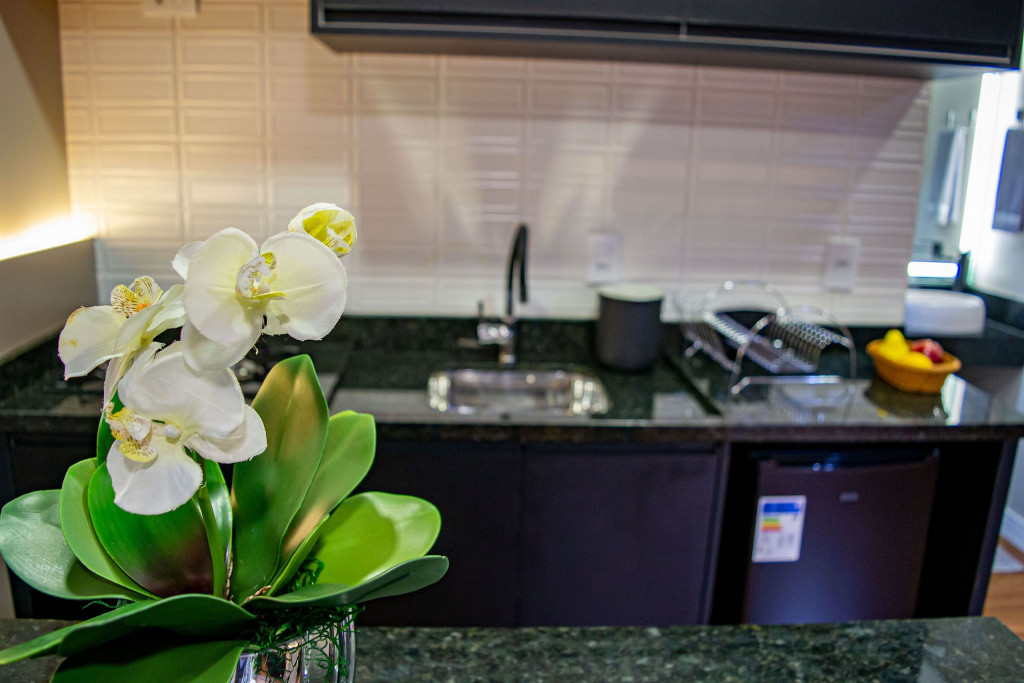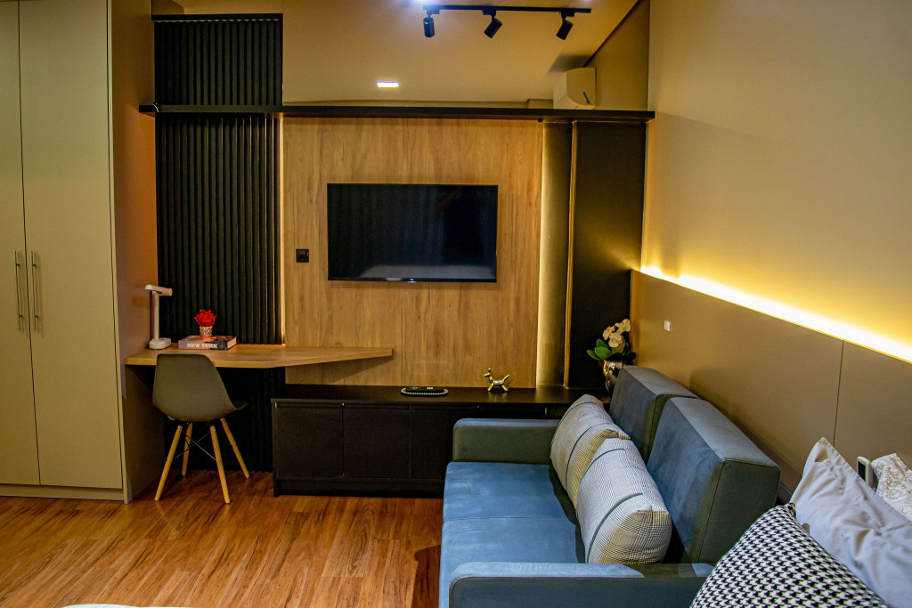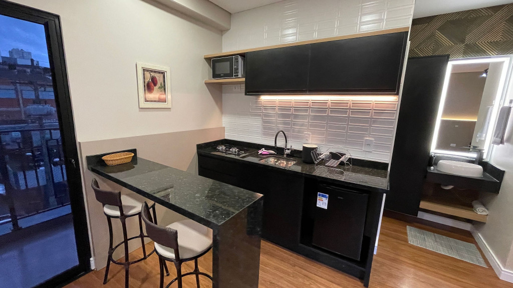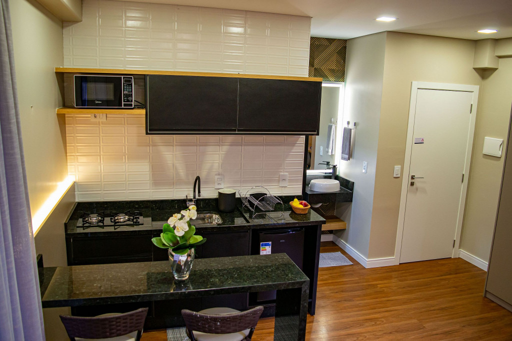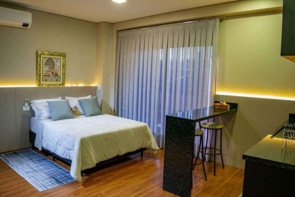 Seus apartamentos contam com cozinha equipada, Smart tv, cama confortável, ar-condicionado que refrigeram todo o espaço, central de trabalho/estudos, enxoval de cama e banho.