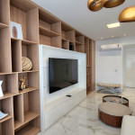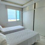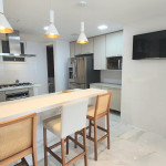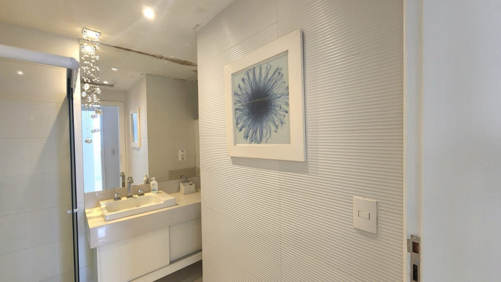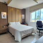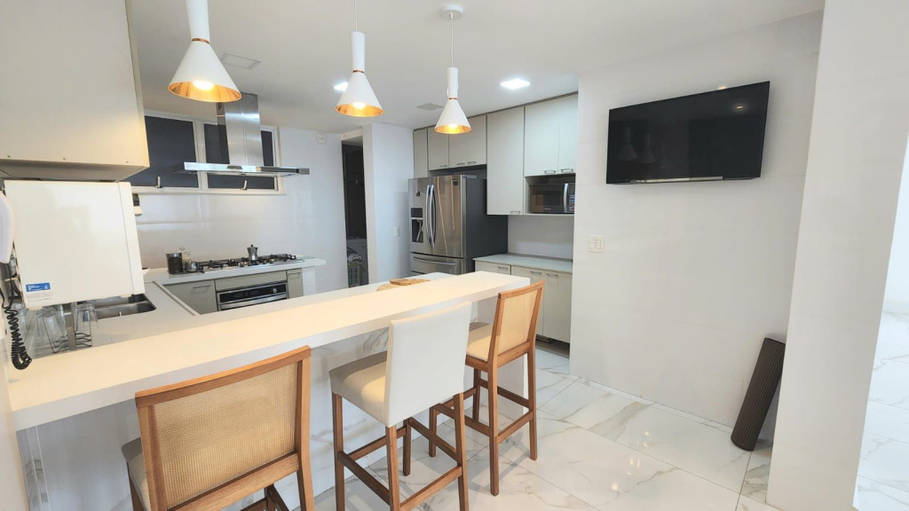 Espaçosa sala dividida em sala de estar, varanda com vista mar, sala de tv e sala de jantar integrada a cozinha toda equipada.
