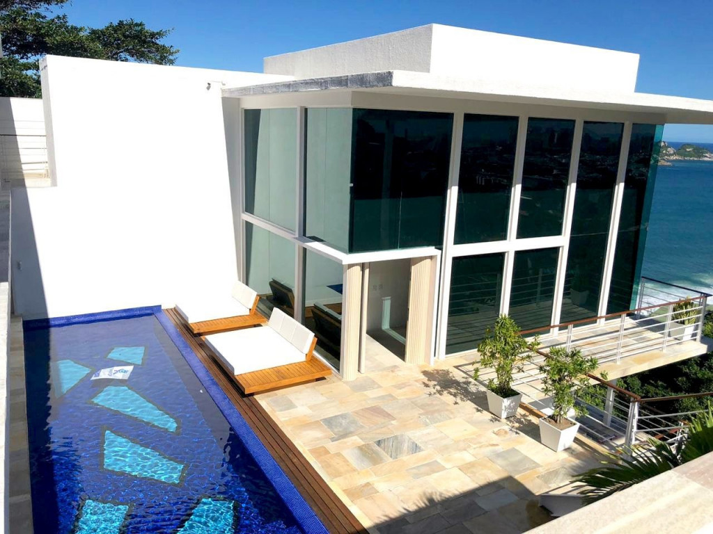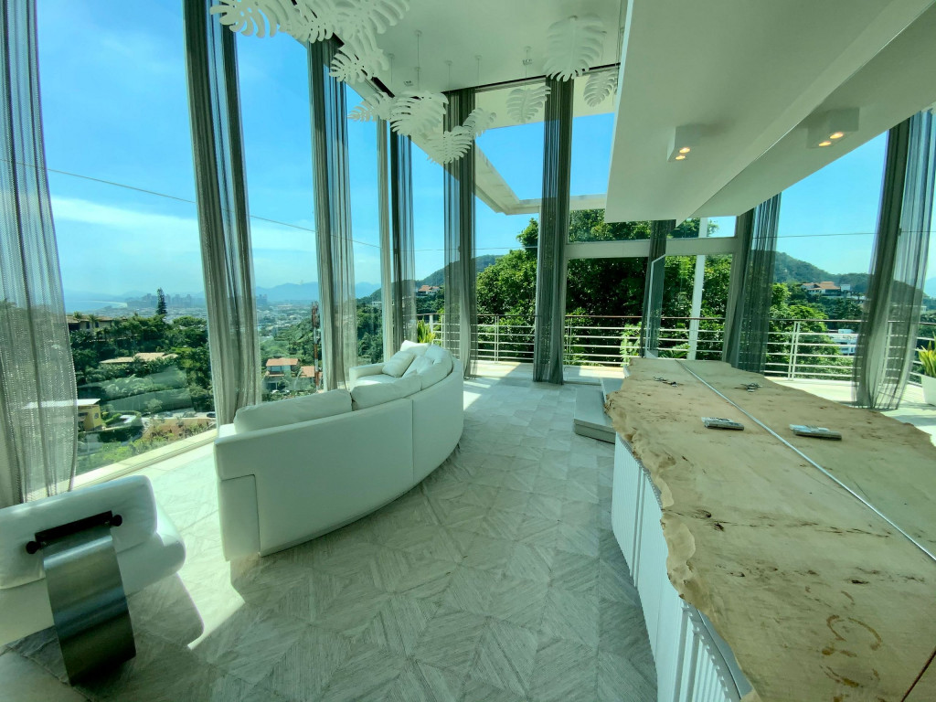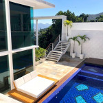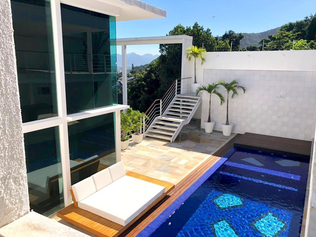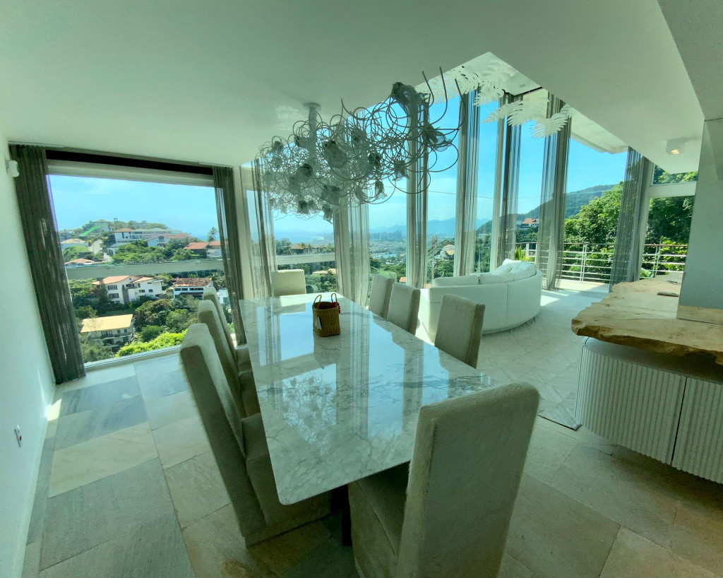 O imóvel possui 03 maravilhosos quartos, sendo 02 suítes, 05 banheiros, sala de estar, sala de TV, mezanino, piscina e área de lazer coberta, além de uma mesa de madeira rústica, ideal para receber os convidados. Todos os cômodos possuem vista para o mar ou para a natureza e, certamente, sua estadia será muito aconchegante, pois o ambiente desta mansão é leve, privativo, seguro e tranquilo. A mansão se encontra no topo da montanha e possui decoração clean, com uma arquitetura moderna contemporânea em que se misturam tons frios e quentes, harmonizando todo o visual. O Bairro do Joá é um dos mais exclusivos e charmosos do Rio. Venha desfrutar desta experiência com seus familiares e aproveite para registrar belíssimas fotos!Hospedagem mínimo de 02 diárias