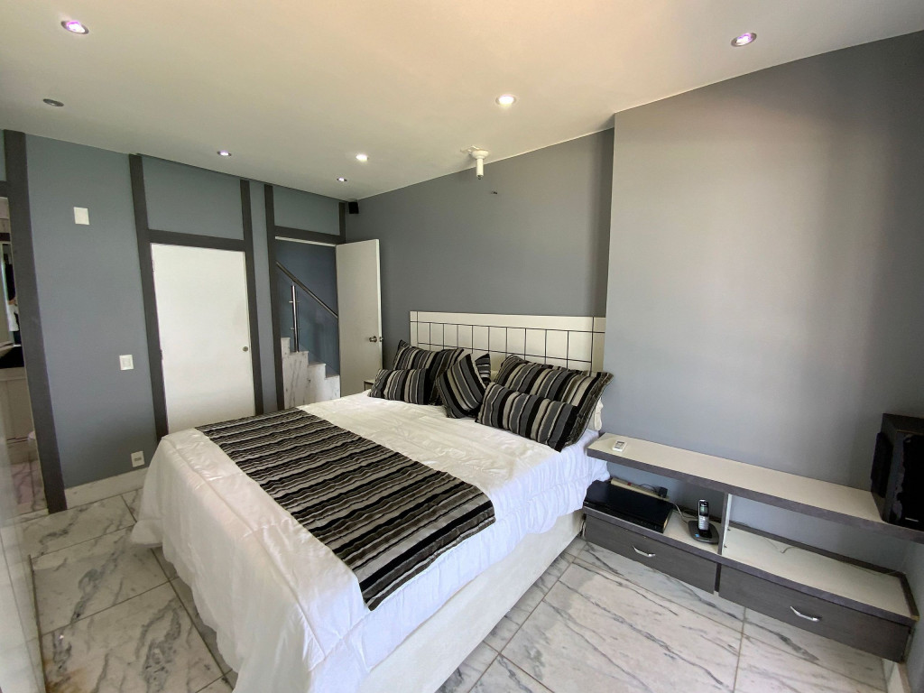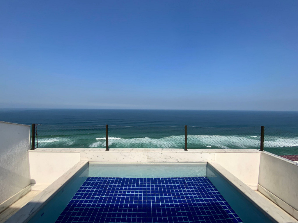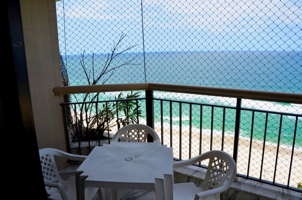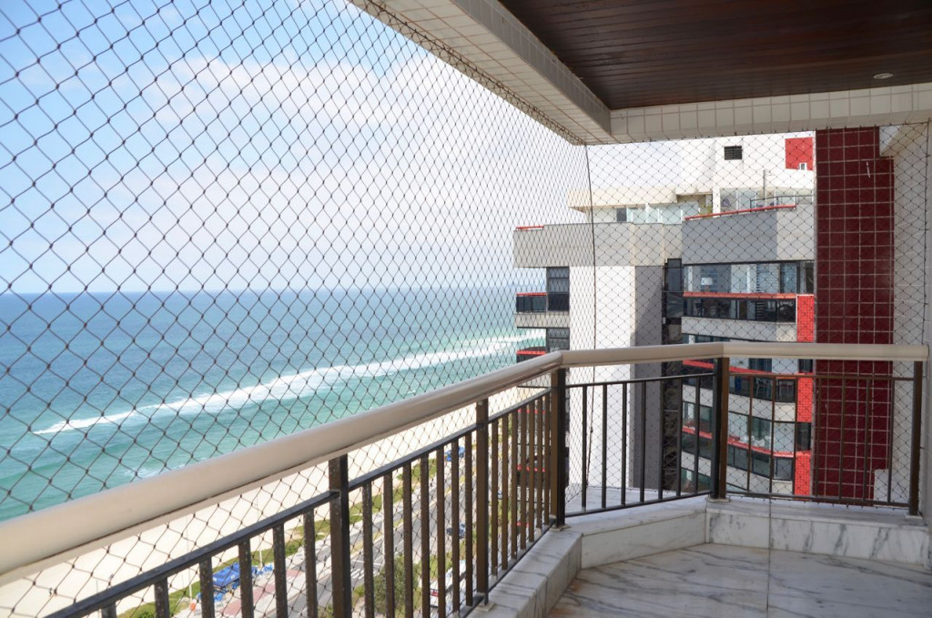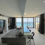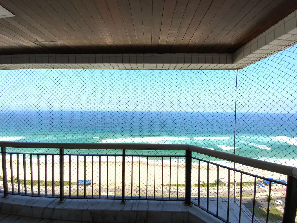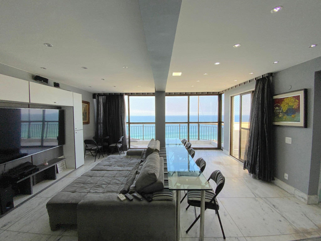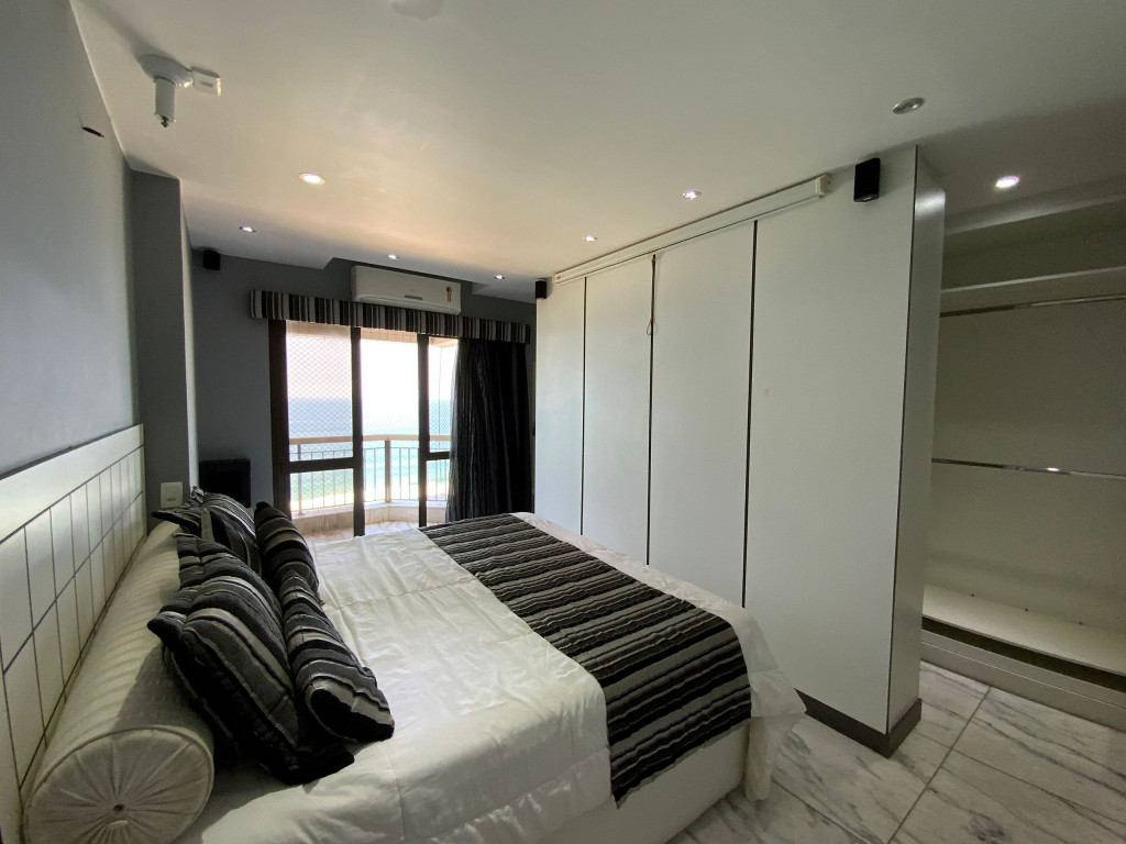 Cobertura triplex frontal mar, com 250m², 03 quartos, closet, 03 TVs, 03 banheiros, sala de estar e jantar, home theater, adega, cozinha completa, máquina de lavar e secar, sauna, piscina e churrasqueira. Todo mobilado com armários embutidos em todos os ambientes, geladeira com gelo e água filtrada na porta, eletrodomésticos todos de aço e telão 120 polegadas na suíte principal. Quartos com cama king size, cama queen, super sofazão retrátil e sofá cama casal, onde dormem até 12 pessoas confortavelmente.