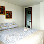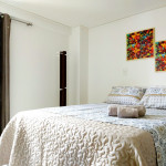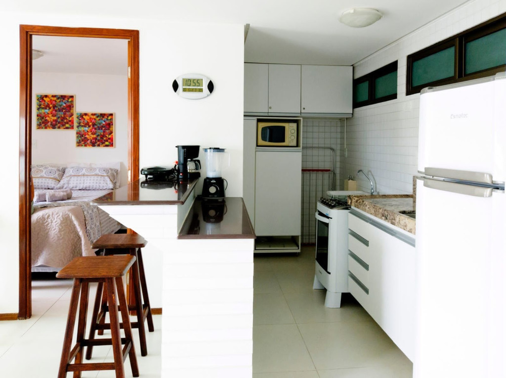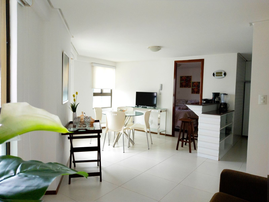 Flat com vista para a piscina. Composto por: sala de estar com mesa, TV e sofá cama, cozinha americana equipada com utensílios para refeições rápidas, suíte com cama casal e ar condicionado e banheiro com box e chuveiro elétrico.
