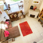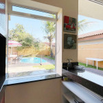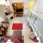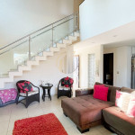 Escada revestida em granito com corrimão em aço inox, 02 suítes sendo uma delas master com sacada vista para a rua e a outra com linda vista para a piscina.