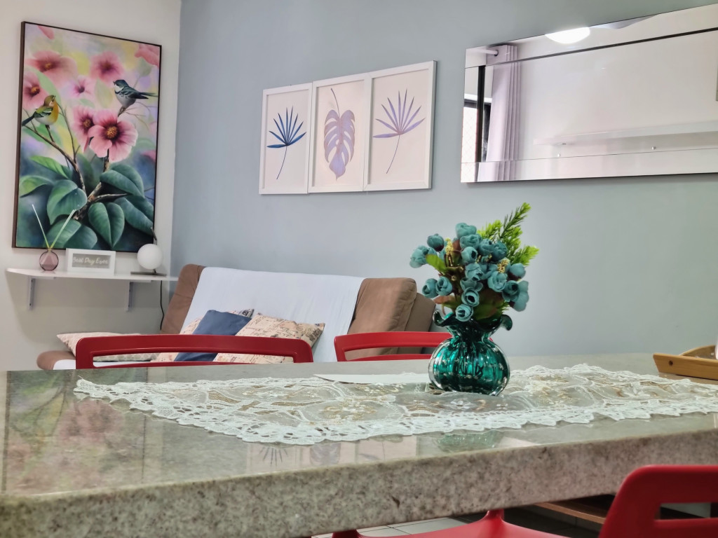 Cozinha completa com todos os utensílios e eletrodomésticos, novos e de qualidade, área de serviço com máquina de lavar roupas.