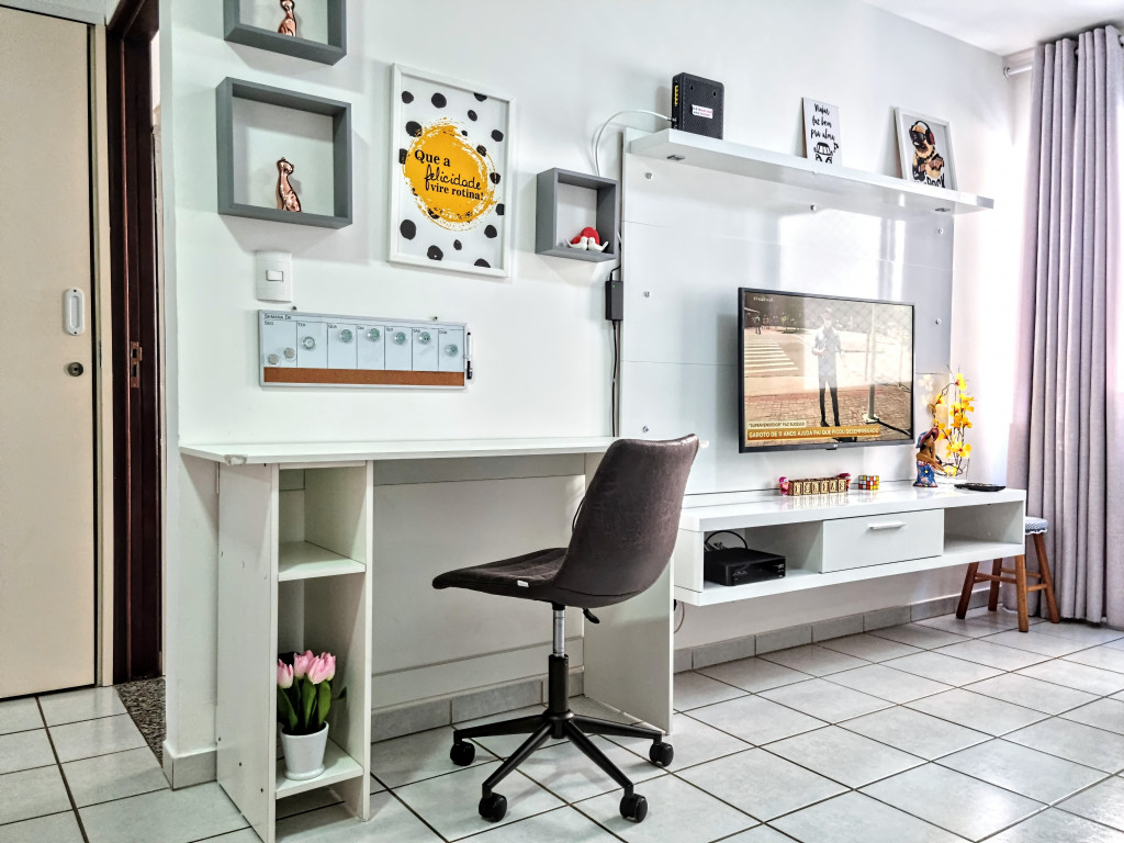 Espaço Home office com mesa de trabalho, cadeira giratória e Wi-Fi de qualidade.