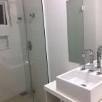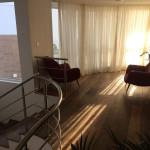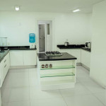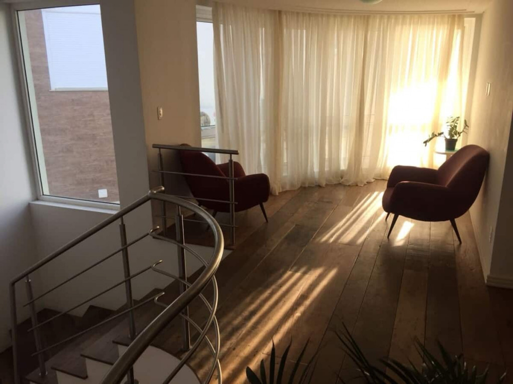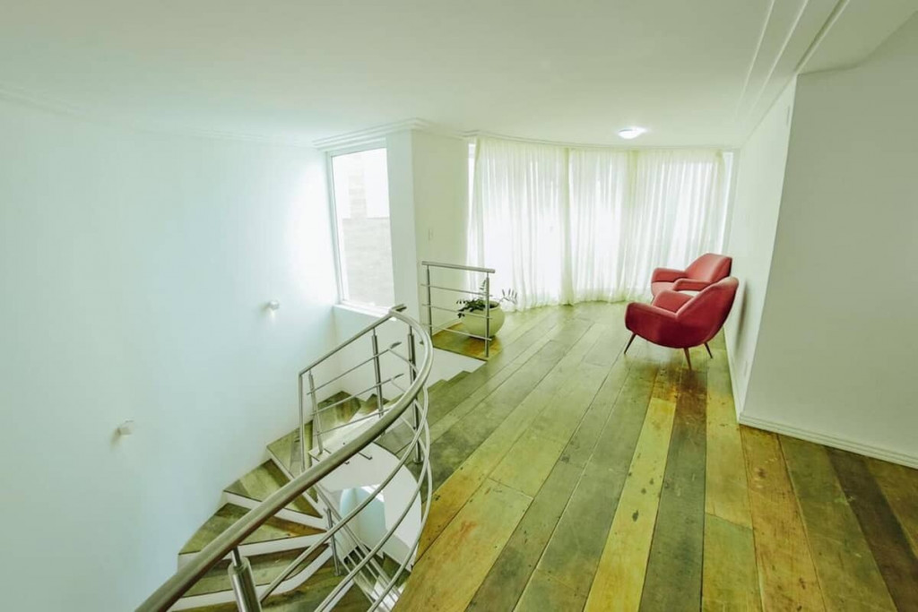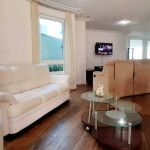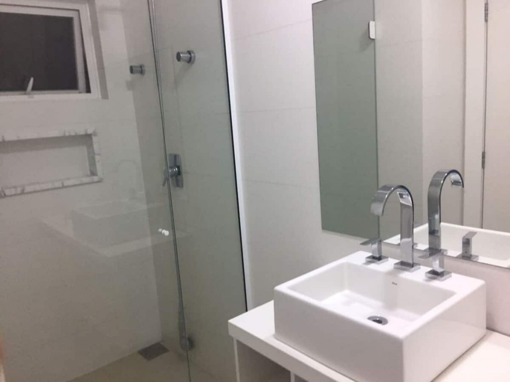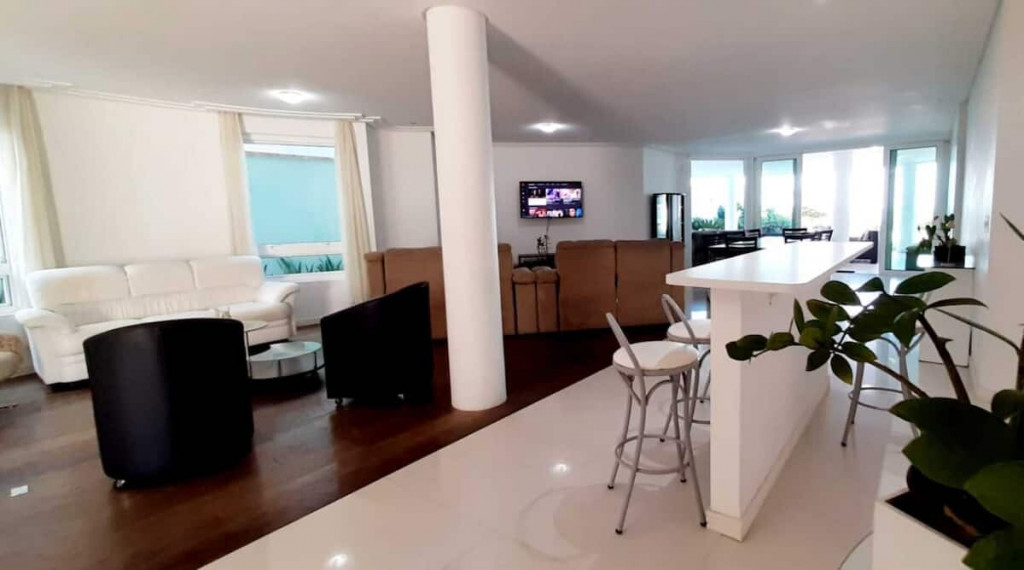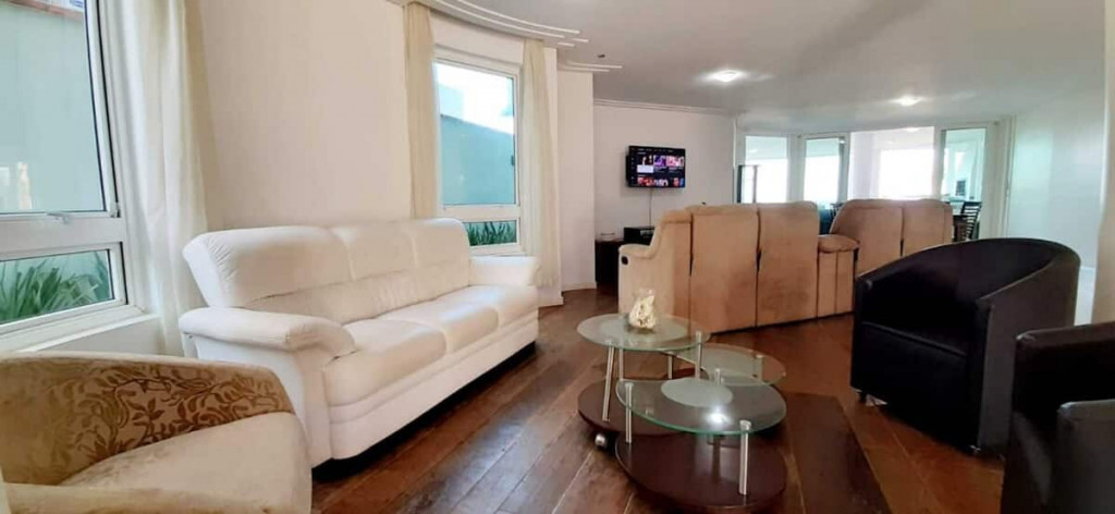 Jardim com área de circulação nas duas laterais, vaga descoberta para 3 (três) veículos, rampa com acesso às vagas do subsolo, hall de entrada, living grande com três ambientes, quarto com cama de casal , banheiro cozinha e área de serviço independente e um lavabo.