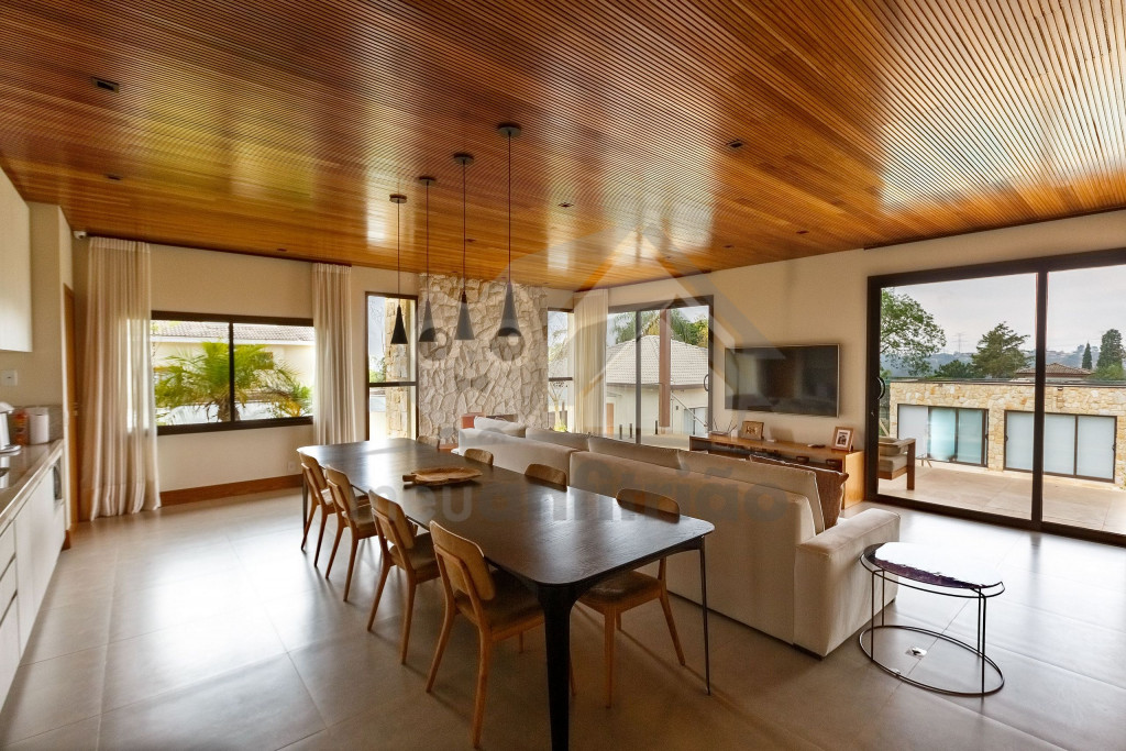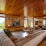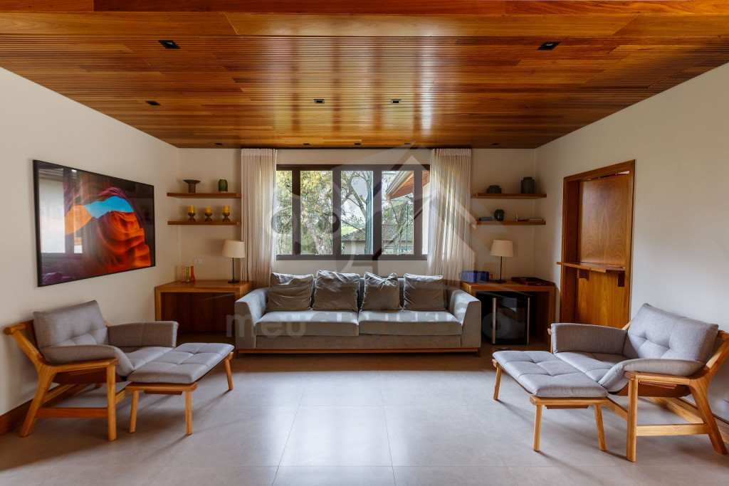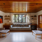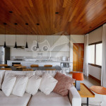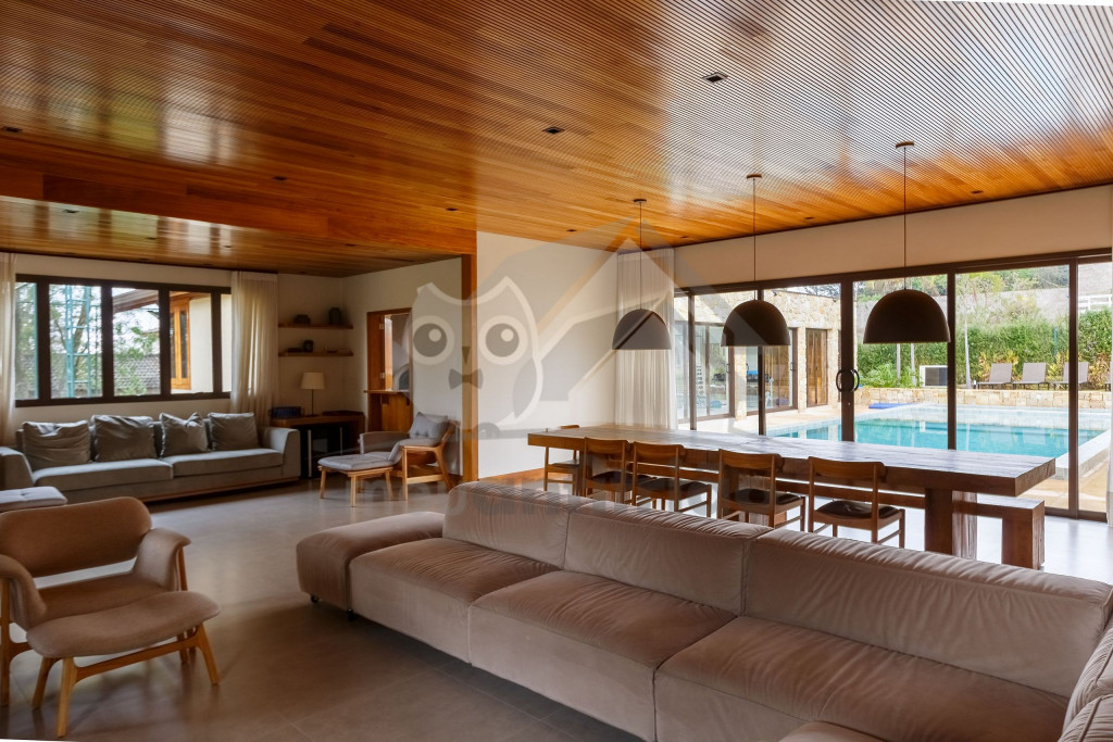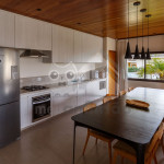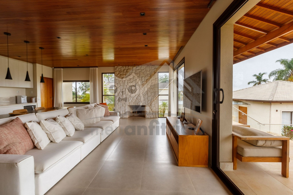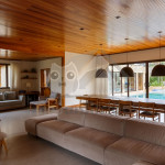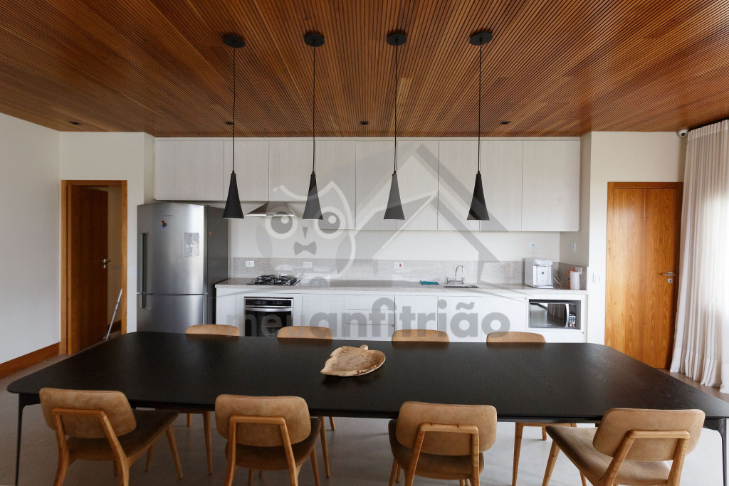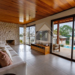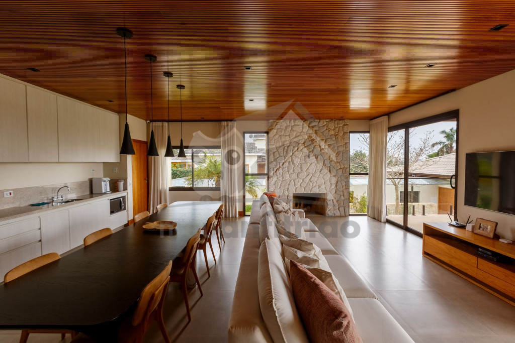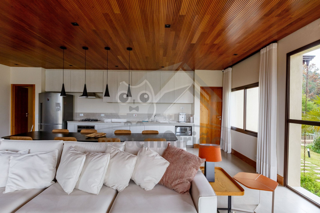 Além dos quartos, área interna conta com ampla sala e cozinha em conceito aberto com teto de madeira que traz conforto e sofisticação ao ambiente.