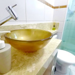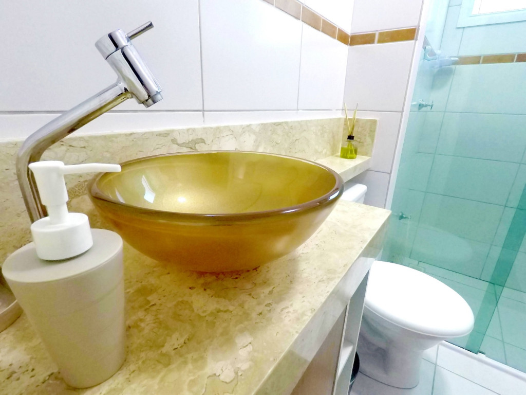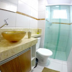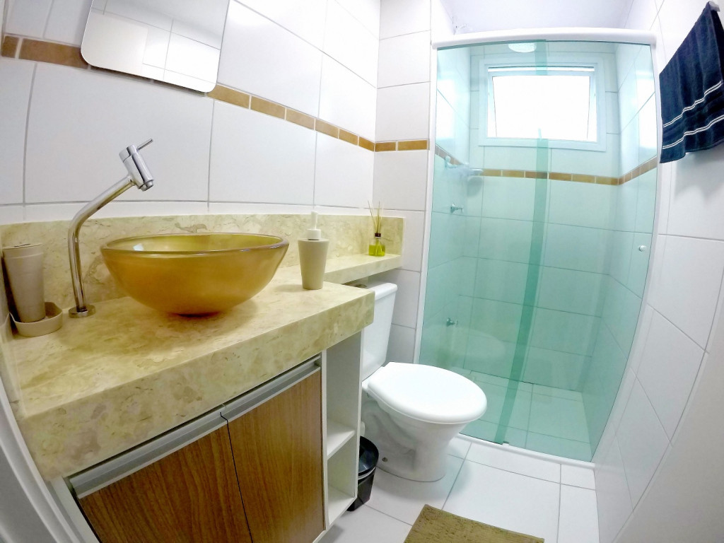 Banheiro com chuveiro com boa pressão d'água, box de vidro, secador de cabelos.