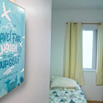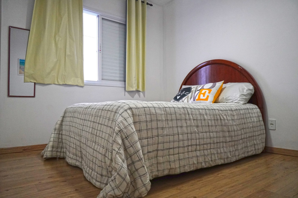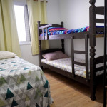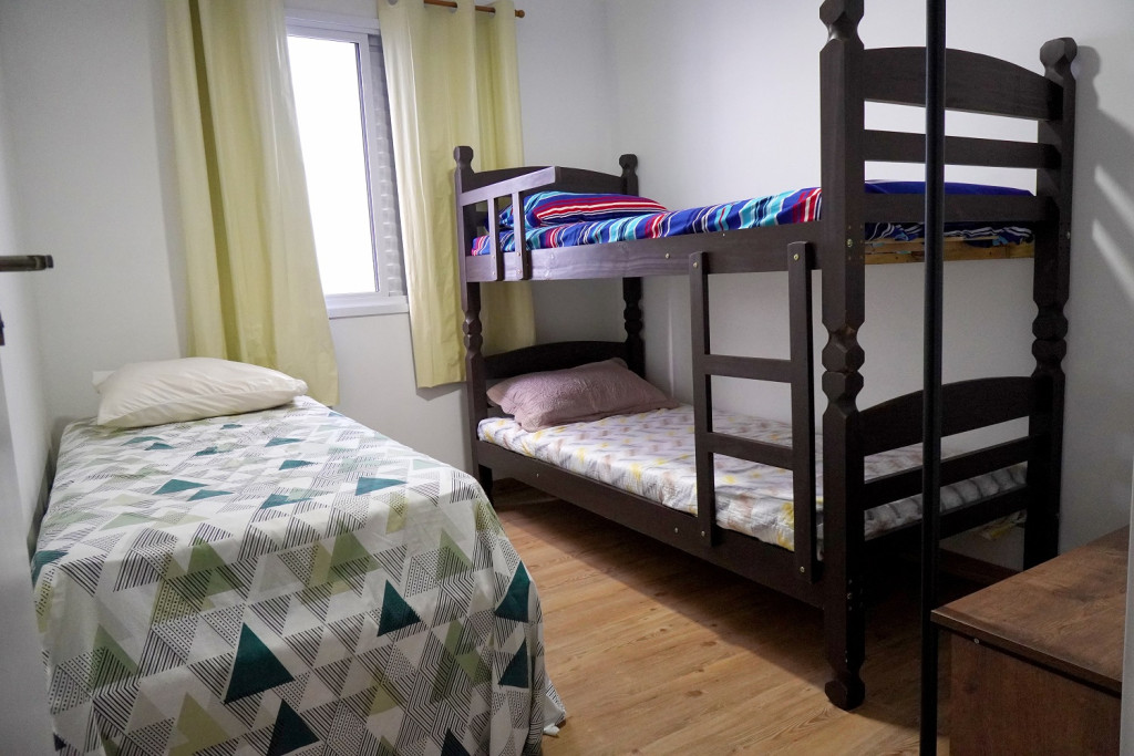 Quarto 2 - Cama de box de solteiro com travesseiro, um beliche com travesseiros e um colchão sobressalente, ventilador de teto, arara para roupas com cabides e espaço para malas, espelho e tela nas janelas.
