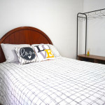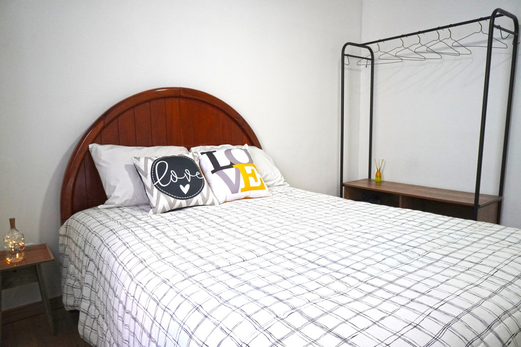 Quarto 1 - cama de casal, travesseiros, ferro de passar, ventilador de teto, arara para roupas com cabides e espaço para malas, espelho e tela nas janelas.