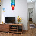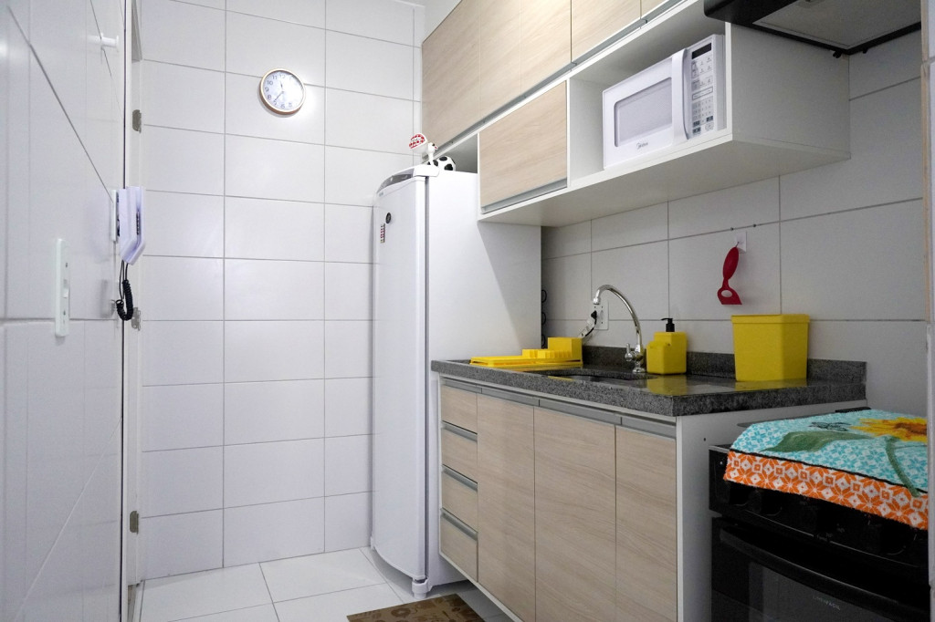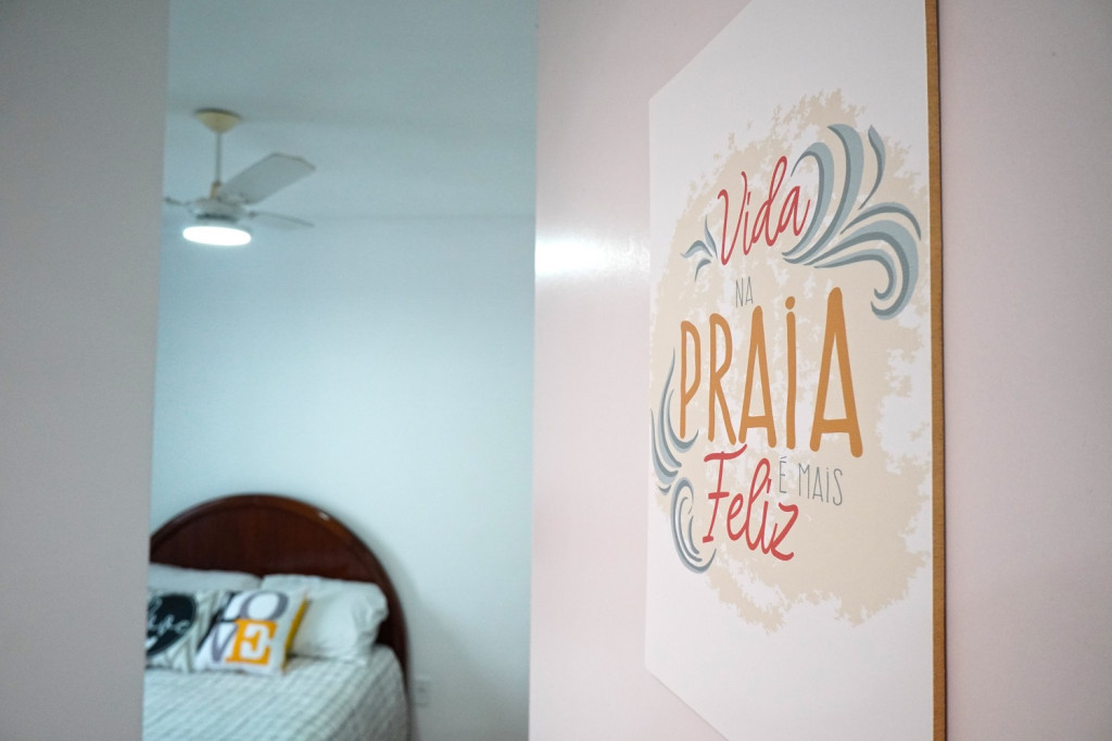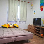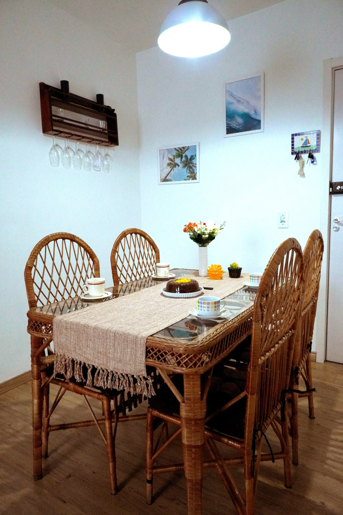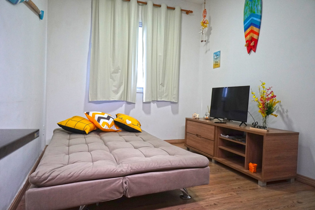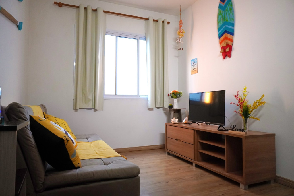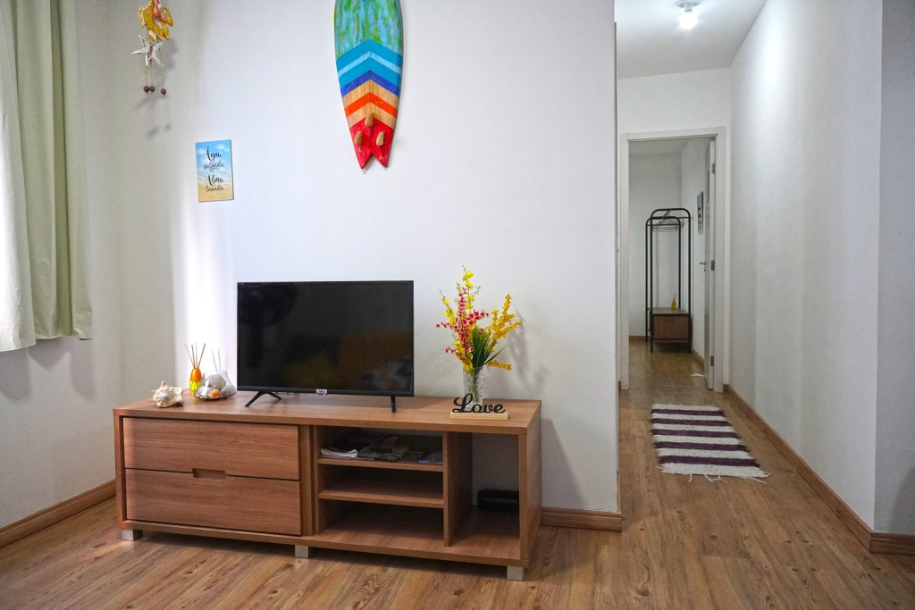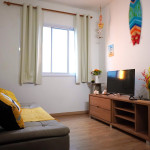 O apartamento dispõe de sala de estar com Smart Tv com Netflix, sofá bi-cama, espaço para refeições com mesa e cadeiras , telas nas janelas.