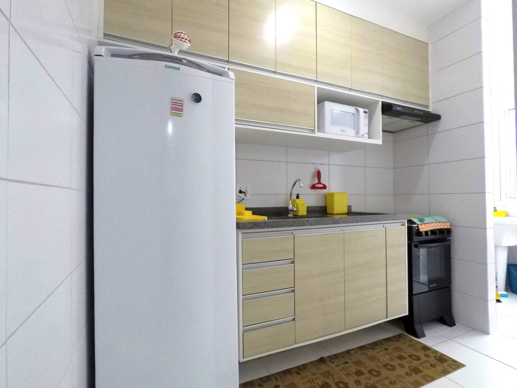 Nossa cozinha totalmente equipada com todos os eletrodomésticos (Geladeira com freezer, microondas, fogão, liquidifcacador, espremedor de frutas, lancheira elétrica) e utensílios (panelas, pratos, copos).