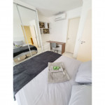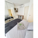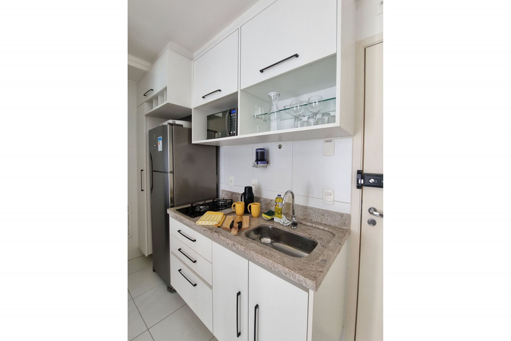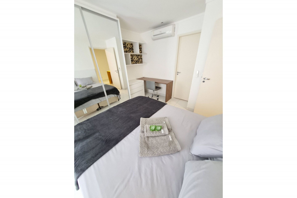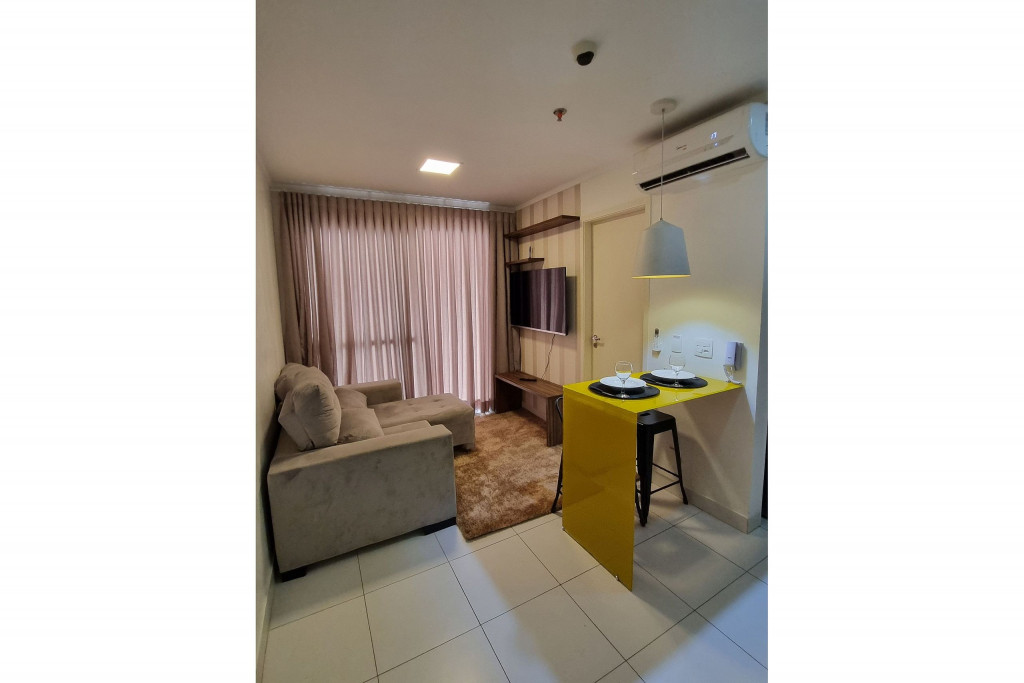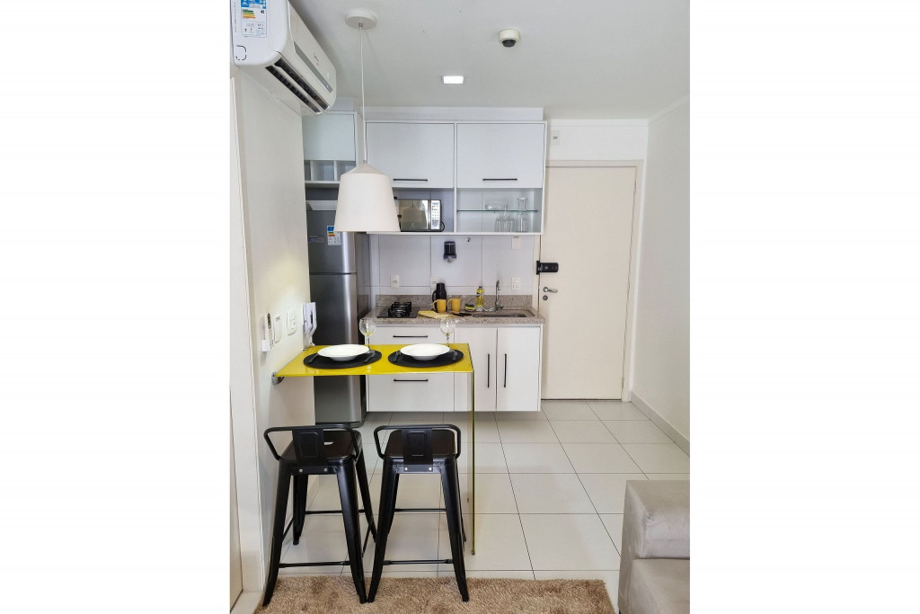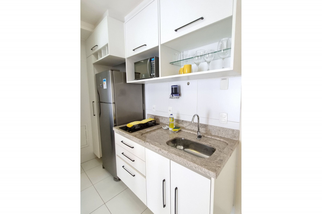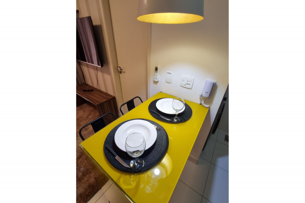 Totalmente exclusivo ao hóspede, o apto conta com uma sala com Smartv, ar condicionado e um confortável sofá. Cozinha repleta em armários, com bancada de jantar romântica e diversos utensílios como: pratos, taças para vinho, copos, panelas, talheres, garrafa para café e sanduicheira. Quarto com cama de casal, ar condicionado, roupa de cama, travesseiros e guarda-roupa. Banheiro com toalhas, sabonete e papel higiênico e uma excelente sacada gourmet com bistrô. Áreas em comum do condomínio estão sujeitas a agendamento na portaria (Lavanderia, Piscina, Jacuzzi, Academia, Salão de jogos, Área de Churrasco).