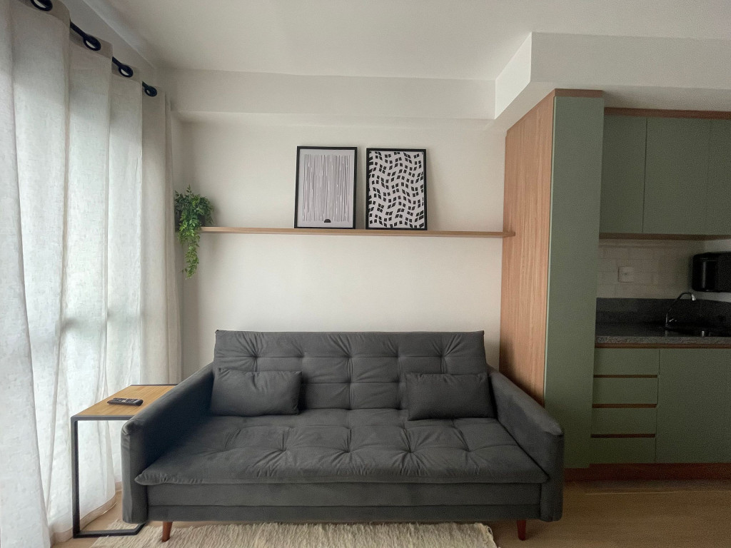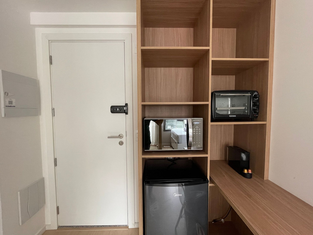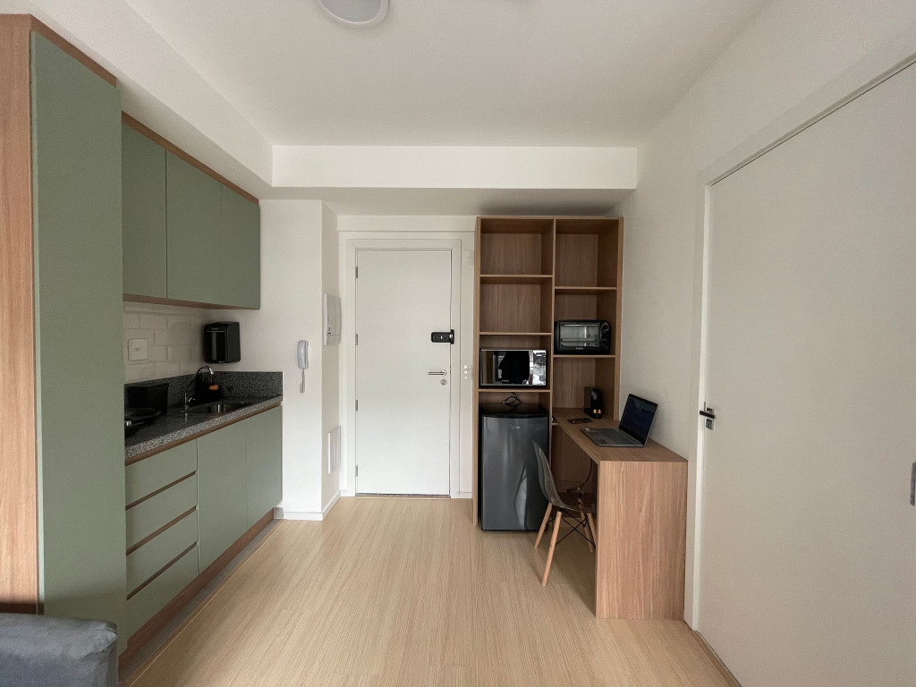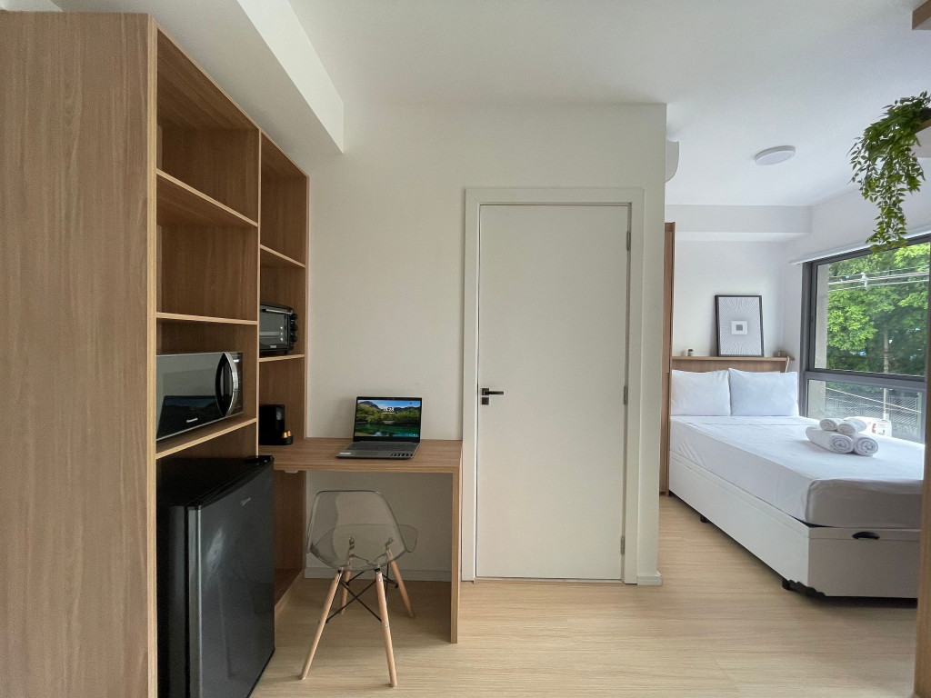 Na cozinha dispomos de utensílios necessários para uma estadia prática, além de banheiro, armário, sofá, escrivaninha para home office, TV Smart e Nespresso. Também dispomos de ar-condicionado (frio e quente) e WI-FI de alta velocidade.