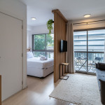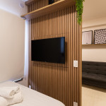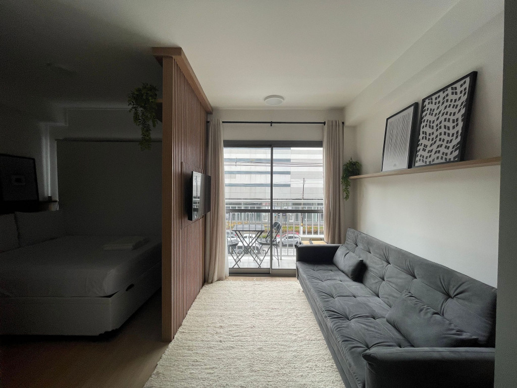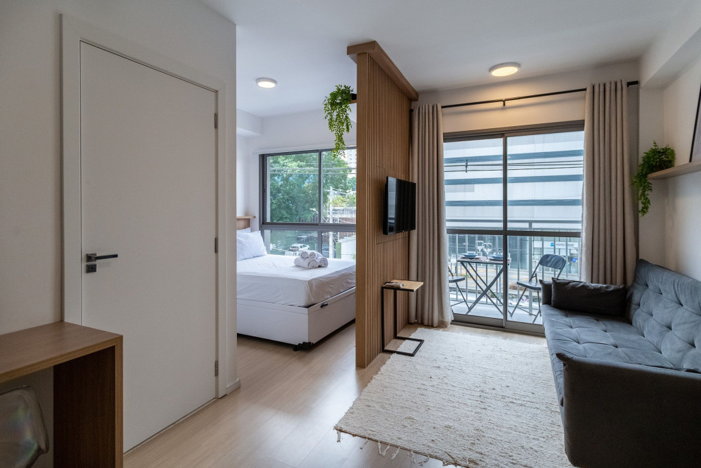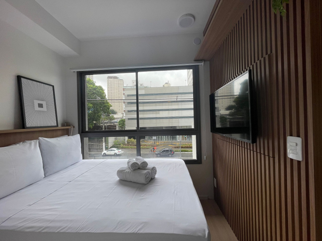 O ambiente do studio é em conceito aberto e acomoda até 3 pessoas em cama de casal e sofá-cama.