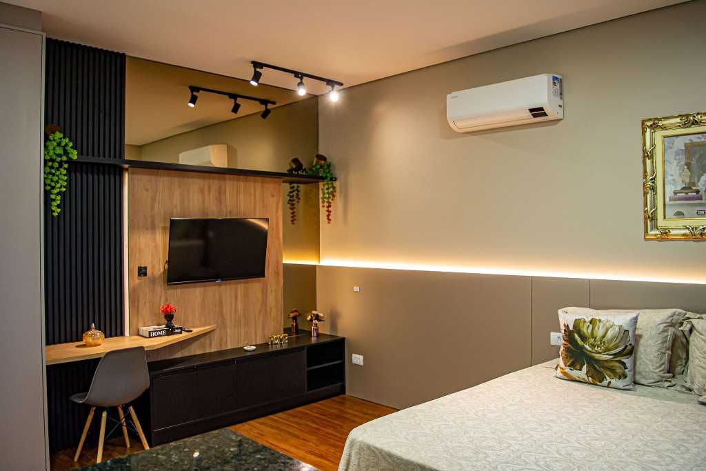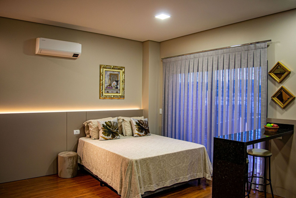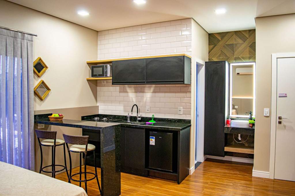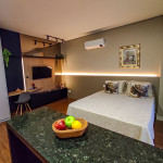 Seus apartamentos contam com cozinha equipada, Smart tv, cama confortável, ar-condicionado que refrigeram todo o espaço, central de trabalho/estudos, enxoval de cama e banho.