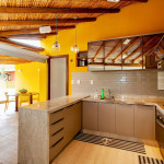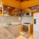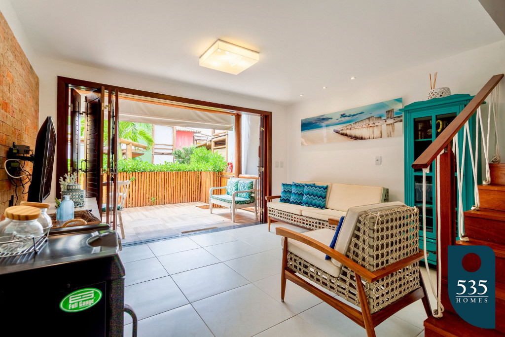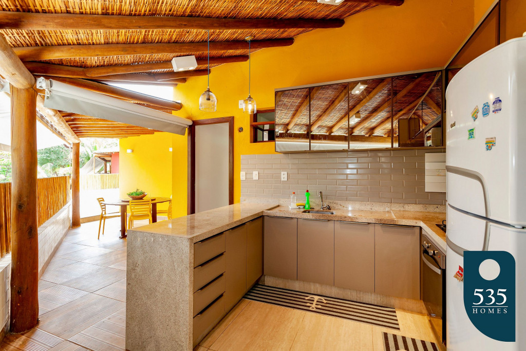 No piso inferior ficam a sala, cozinha, um quarto com cama de casal, varanda, pátio com chuveirão.