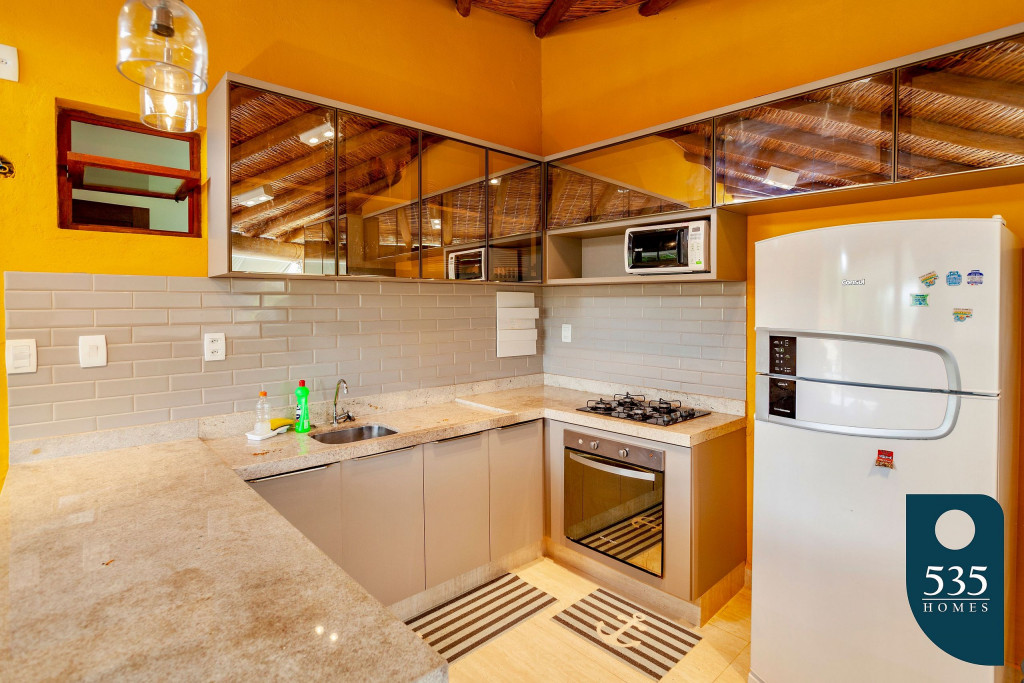 Cozinha equipada com: forno, fogão, geladeira, microondas, cervejeira, panelas, pratos, copos, taças, talheres dentre outros utensílios.
