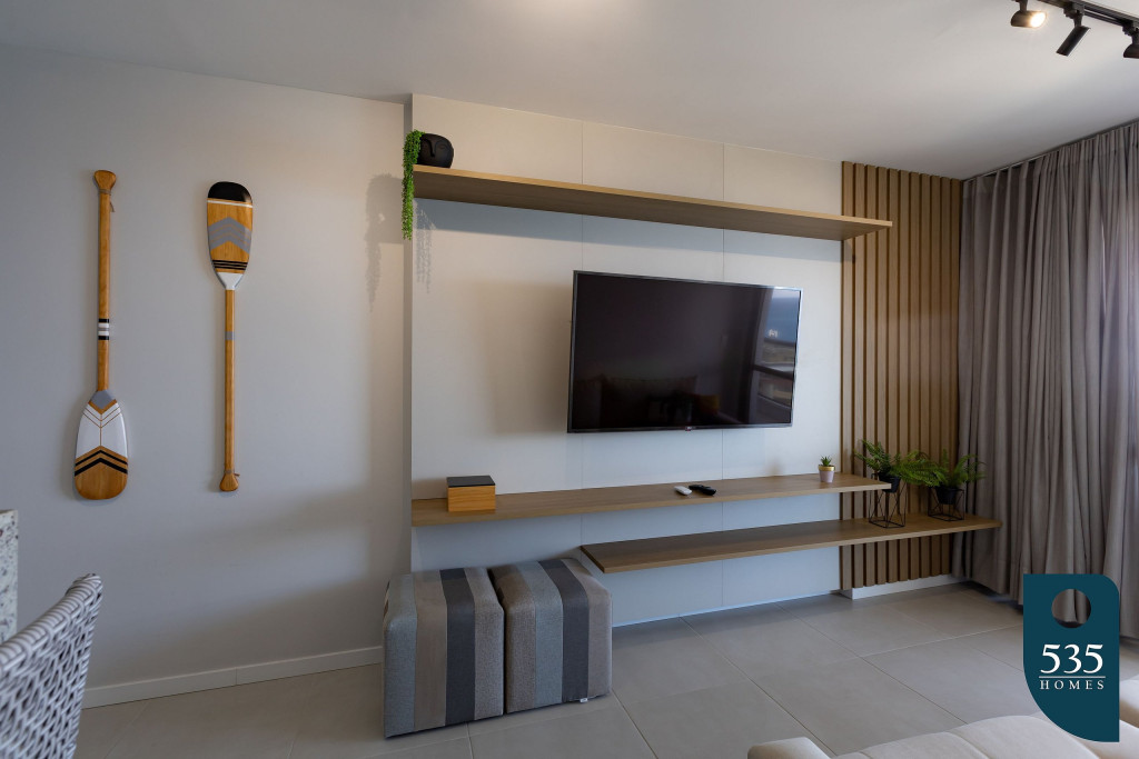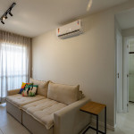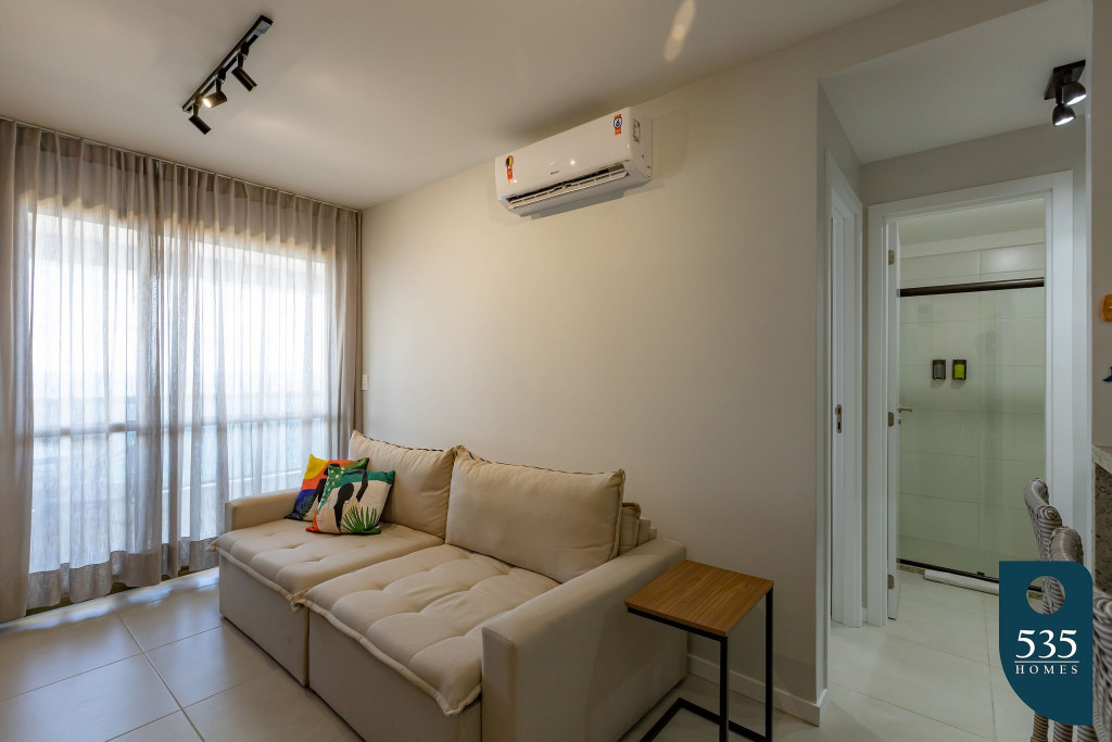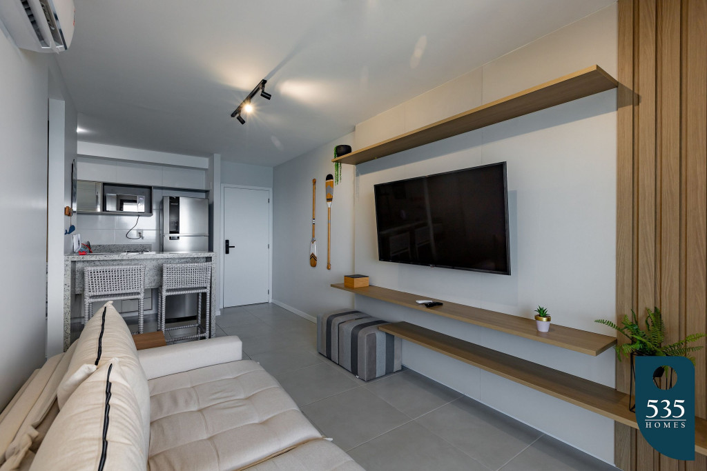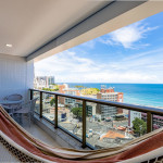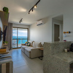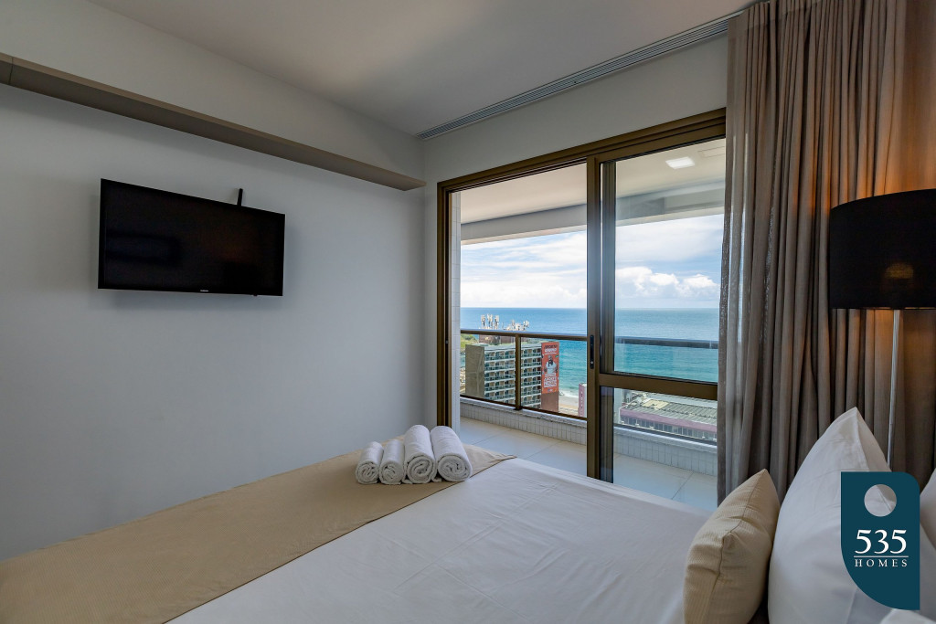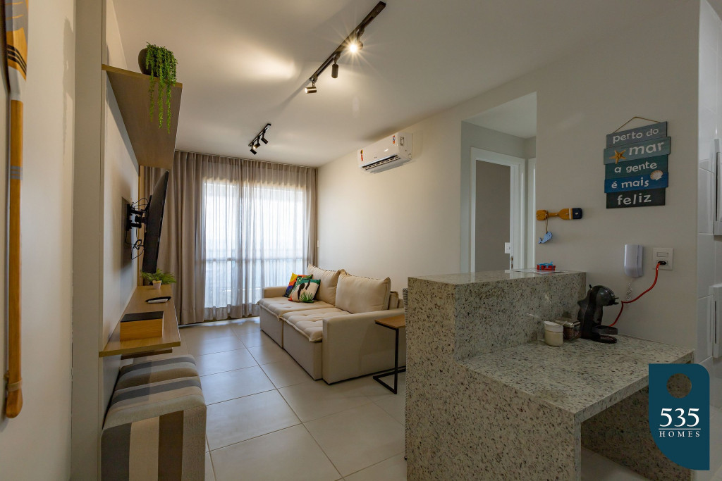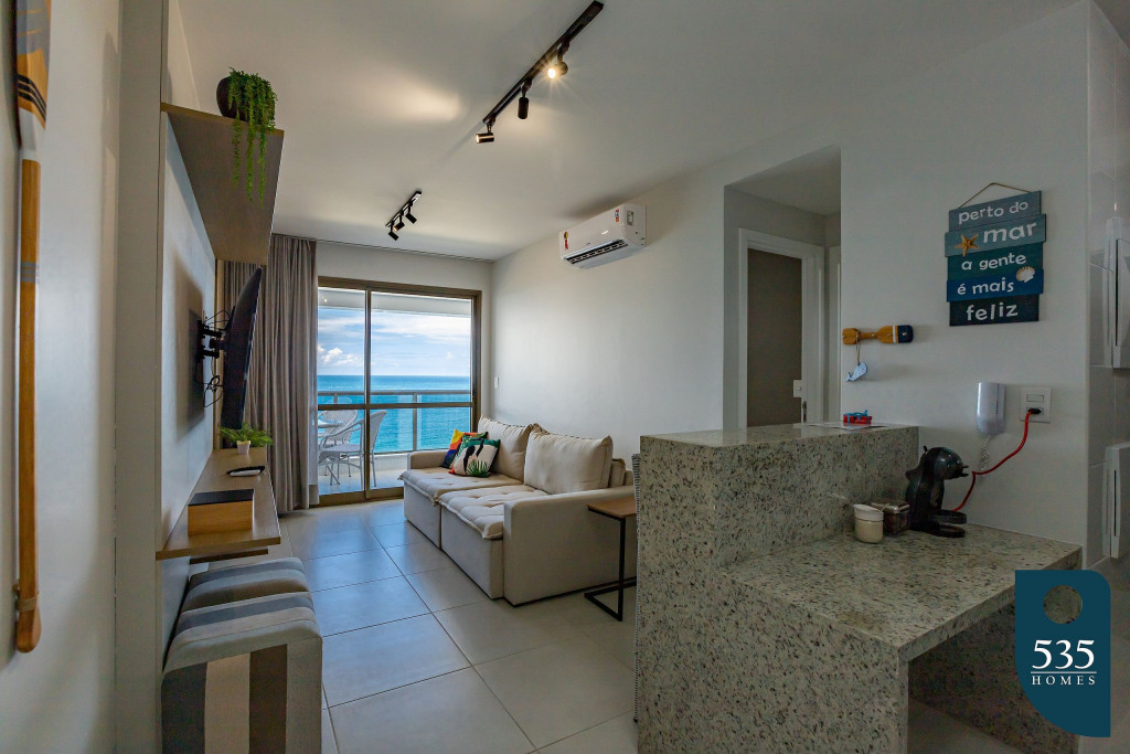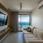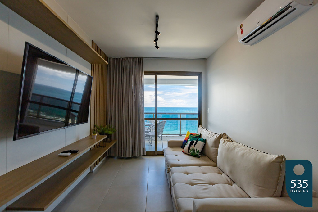 Apartamento incrível, novo com vista para o mar de 48 m² super decorado com sofá cama muito confortável para assistir televisão ou dormir 2 pessoas, quarto com cama Queen e ar condicionado Split. Área externa espetacular para tomar aquele café e apreciar a vista para o mar do 9° andar do prédio. Nossa cozinha é espaçosa e equipada com todos os utensílios necessários.