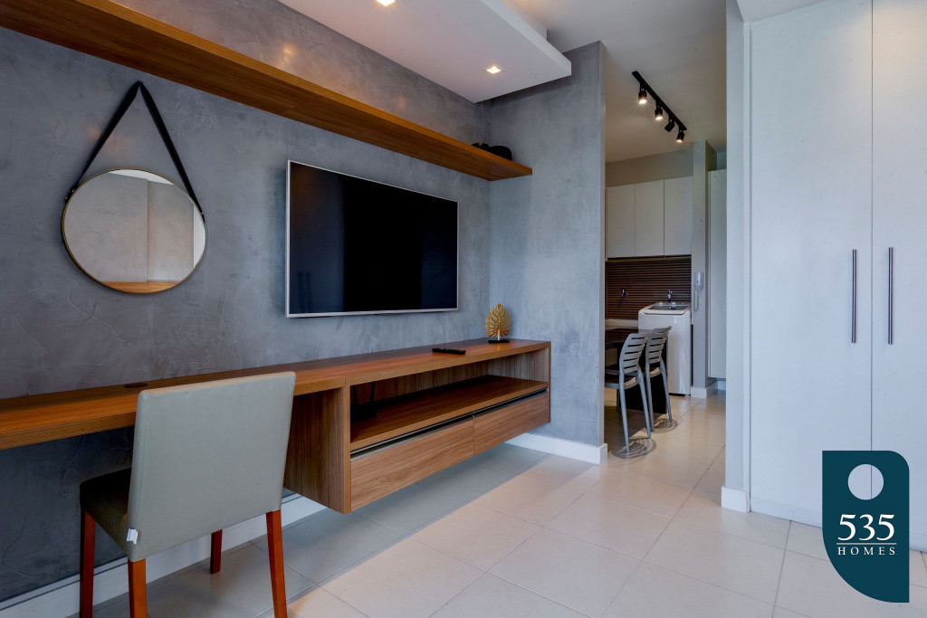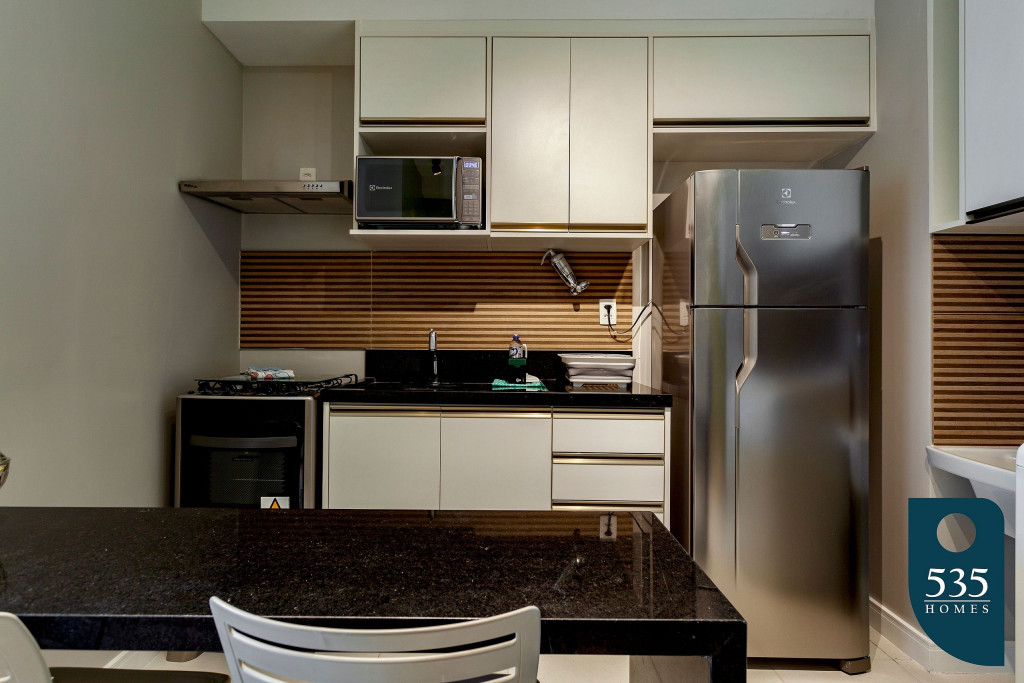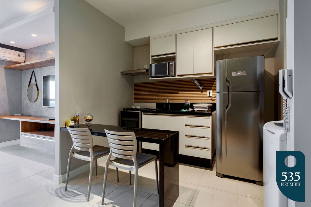 O espaço está equipado com TV LED de 50" Smart, Ar condicionado Split no quarto, Geladeira, Liquidificador, Microondas, Cafeteira Dulce Gusto, Sanduicheira grill, Filtro de água, Secador de cabelo, Ferro e mesa de passar roupas, Máquina de lavar roupas e enxoval profissional de hotelaria.