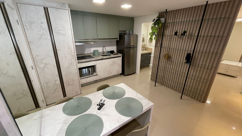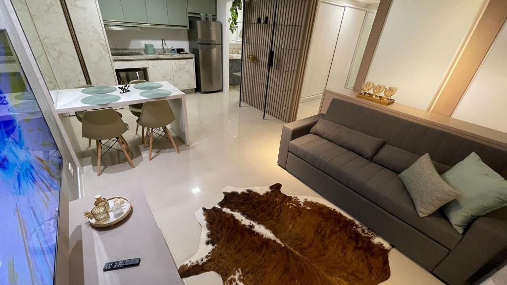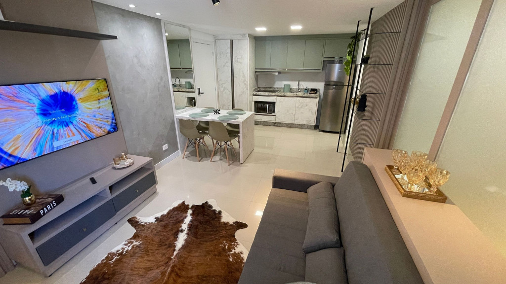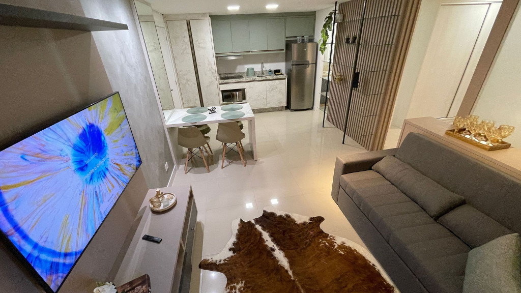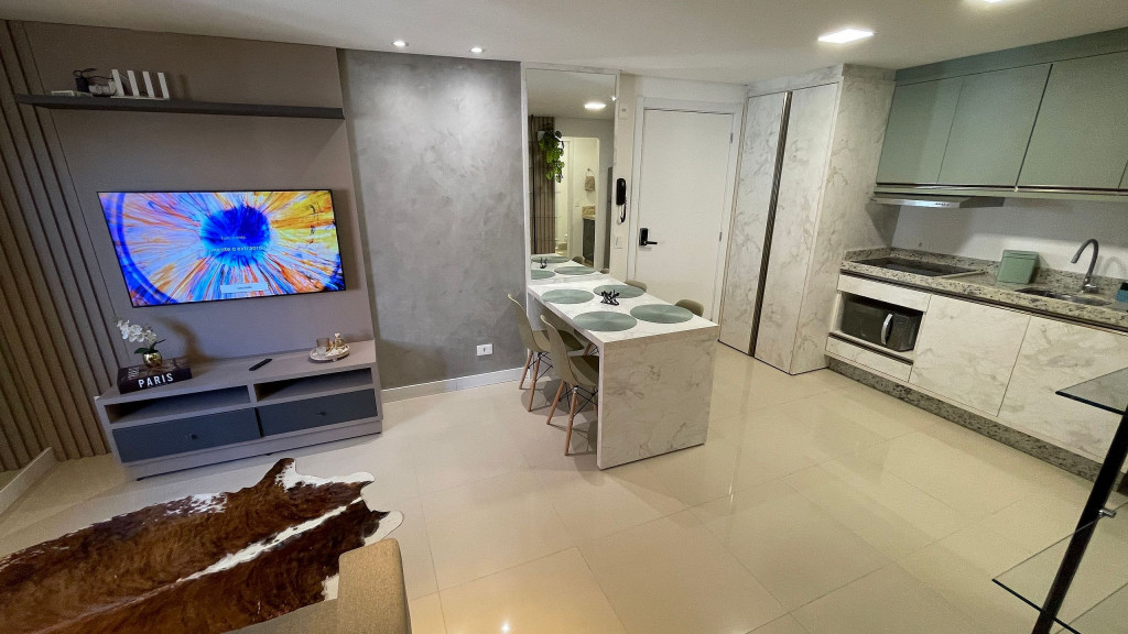 Sua localização possibilita acesso rápido e fácil aos principais pontos turísticos da cidade por meio de transporte público, dentre outros. O espaço conta com: - - 01 quarto com cama casal e armários; - 01 sala com sofá cama CONFORTÁVEL para até 02 adultos; - 01 colchão de solteiro (PARA O QUARTO HÓSPEDE OU CONTRATAÇÃO PRÉVIA) ; - Cozinha básica para uma boa hospedagem; - Wi-fi de 150mb. Equipamentos: - Ar condicionado no quarto; - Geladeira, fogão 4 bocas de indução (elétrico), micro-ondas, cafeteira, chaleira, ferro a vapor, depurador de ar; - TV Smart 43 polegadas, com sinal locais abertos e NETFLIX; - Enxoval de cama e banho; - Enxoval de cozinha com taças de vinho, jogo de panelas em inox , jogo de jantar e café completo, jogo de talheres e demais utensílios; - Mantimentos mínimos como pó de café, açúcar e sal; Infraestrutura do condomínio: -Lavanderia com lava roupas e secadoras (serviço pago a parte - consultar previamente); -Portaria com acesso por botton eletrônico; -Acesso ao apartamento com fechadura digital através de senha a ser cadastrada; O atendimento aos hóspedes será sempre que necessário e solicitado. Check-in flexível a partir das 15h e Checkout até às 10h. O apartamento está a 220 metros da avenida Jorge Schimmelpfeng, conhecida como Avenida Gastronômica e que também dá acesso às principais avenidas da cidade. Nela, estão diversas opções gastronômicas tais como: choperias, petiscarias, comida japonesa, steak house, frutos do mar, massas etc. E um pouco mais distante, a cerca de 1,2 km, temos o Zeppelin Old Bar, que combina boa música e boa comida, e quase em frente, para quem curte chopp artesanal, tem o Eden Steak Garden e Chopperia. E ainda conta com uma padaria bem ao lado do prédio. Acesso ao transporte público a uma quadra, inclusive para a Argentina e Paraguai.