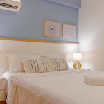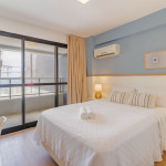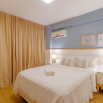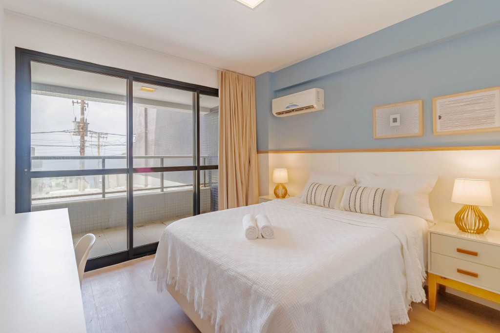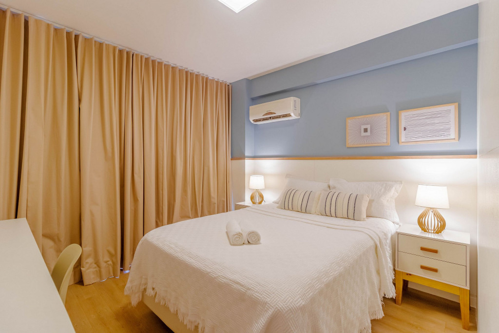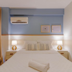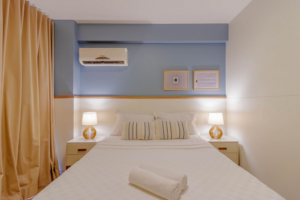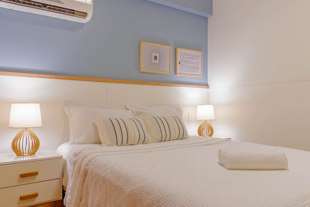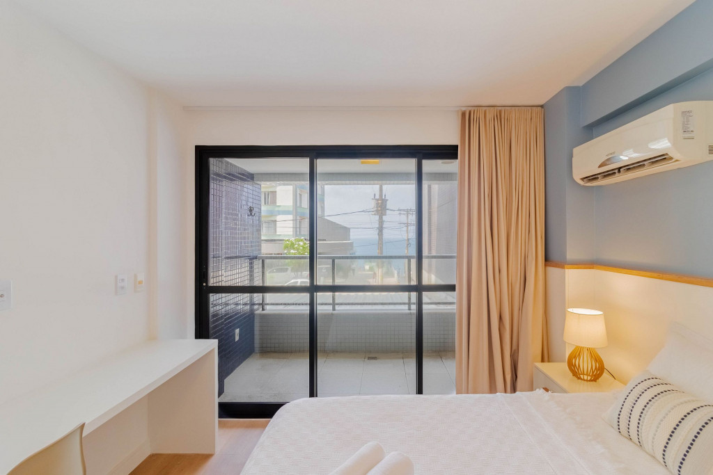 A composição dos quartos é da seguinte forma:Suíte 1: 1 cama casal, ar condicionado split, armário, cortina blackout e varanda com vista mar;Suíte 2: 1 cama casal, ar condicionado split e armário.OBS: Sofá cama na sala de estar