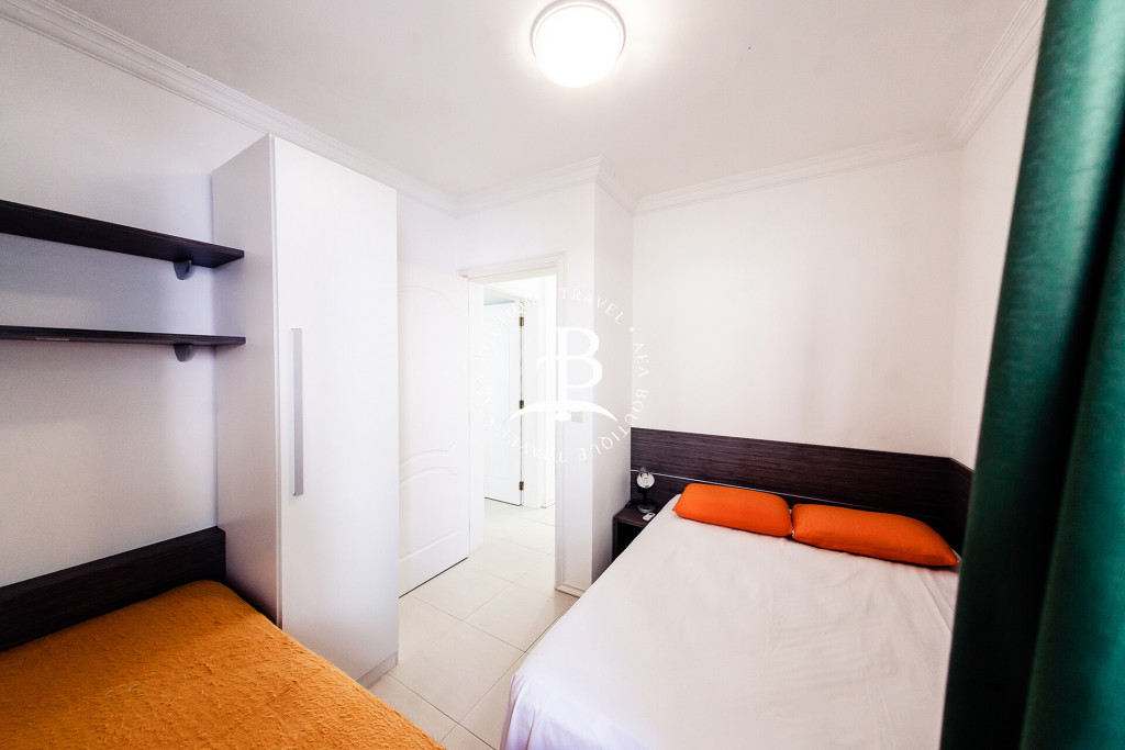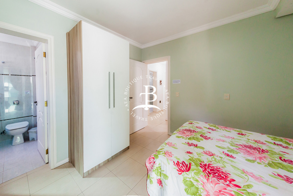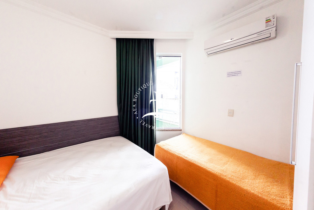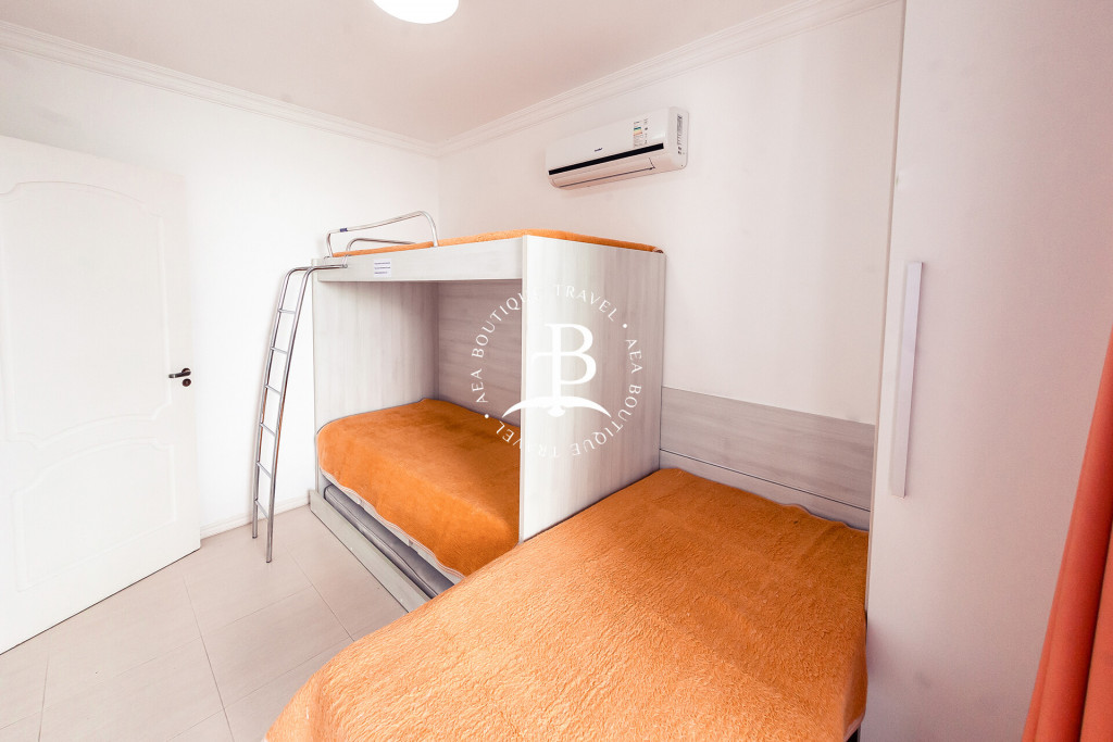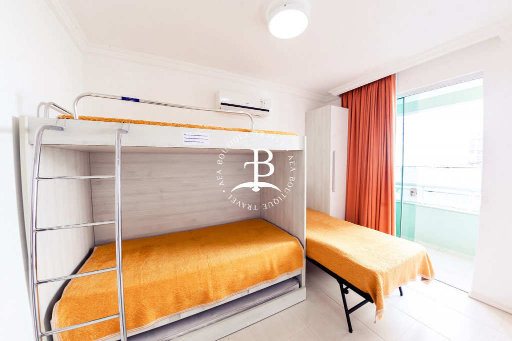 Os dormitórios todos com ar condicionado Split. Configuração dos quartos: quarto 1: suíte com 1 (cama) casal e varanda. Quarto 2: suíte com 1 (cama) casal e 1 cama individual. Quarto 3: com 1 um beliche + cama auxiliar e 1 cama individual, varanda e banheiro no corredor.