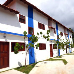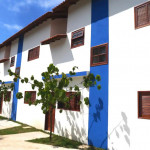 A casa fica em um pequeno condomínio de três casas, cada uma com quintal próprio.