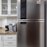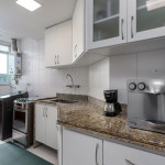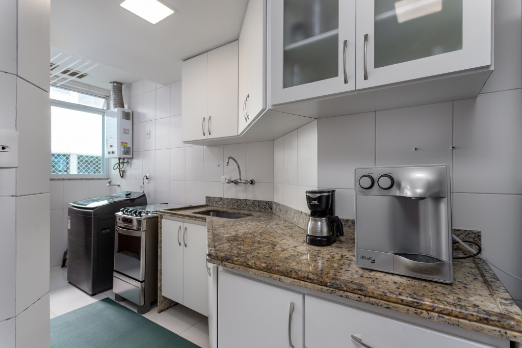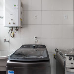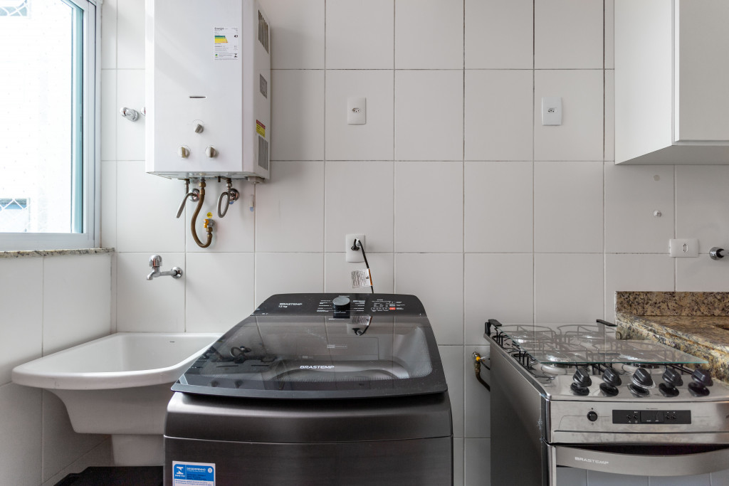 Cozinha completa com fogão, Máquina de lavar roupas e cafeteira.