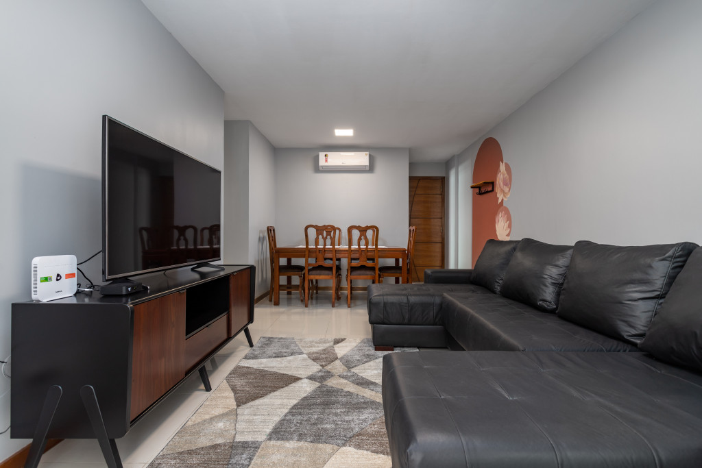 Confortável, aconchegante e recém mobiliado. Ampla sala de estar com internet e TV a cabo. Sofá cama e mesa de jantar para 06 pessoas.