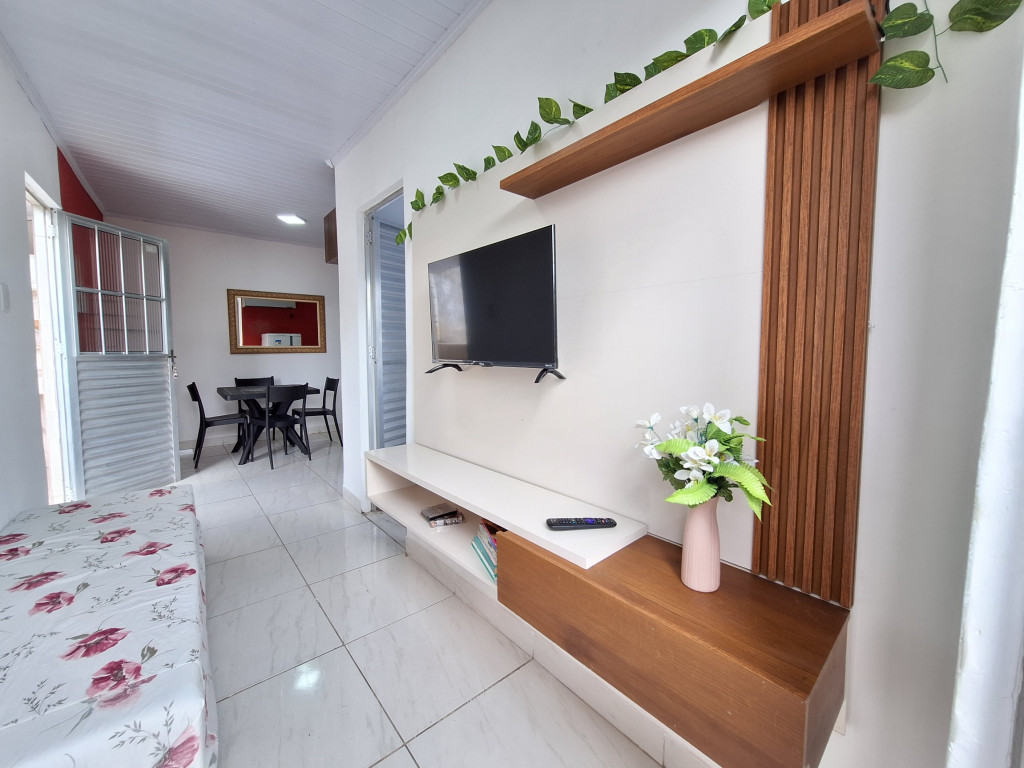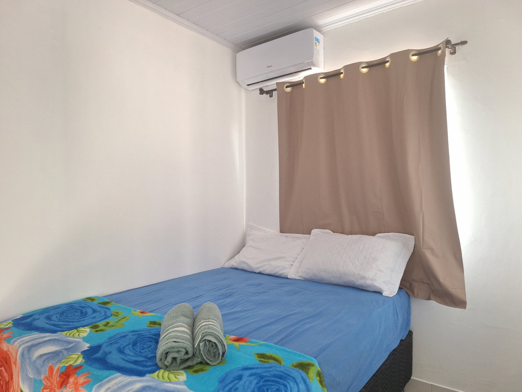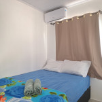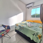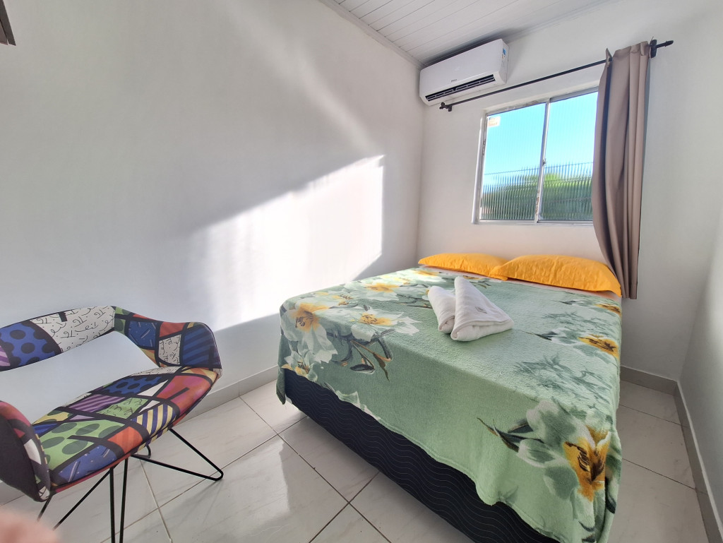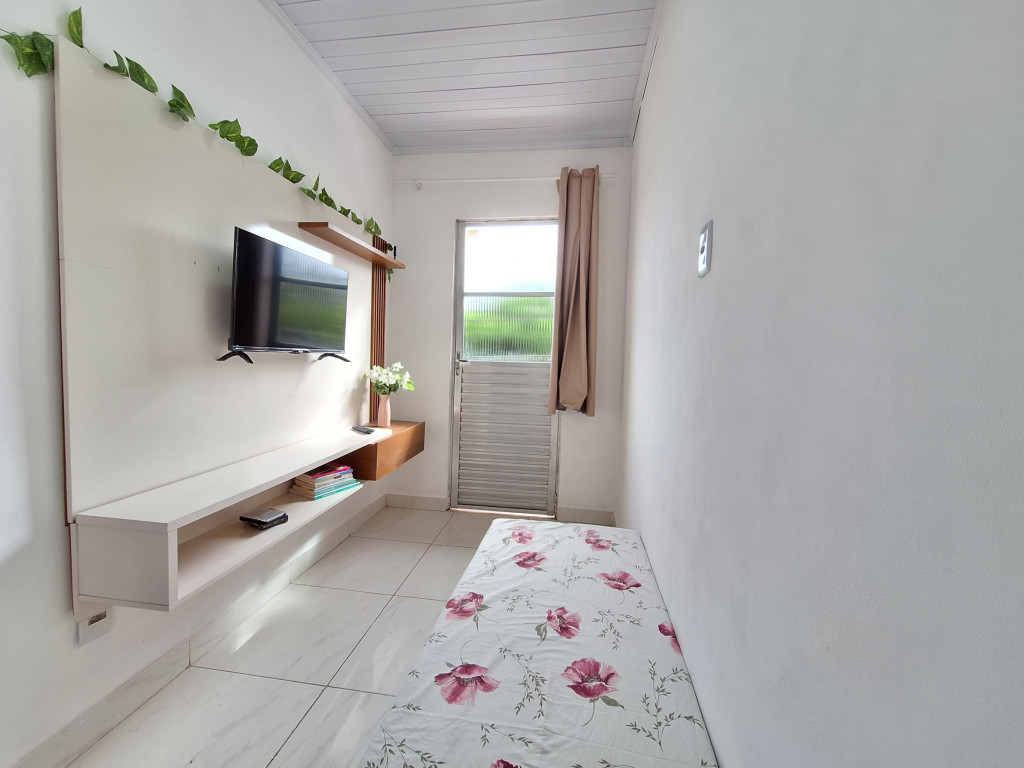 O quarto tem um ar condicionado de 9.000 BTU e cama de casal. Na área de serviço, há um tanque para lavar roupas. Banheiro completo.