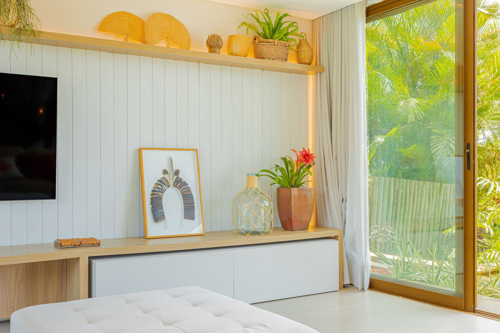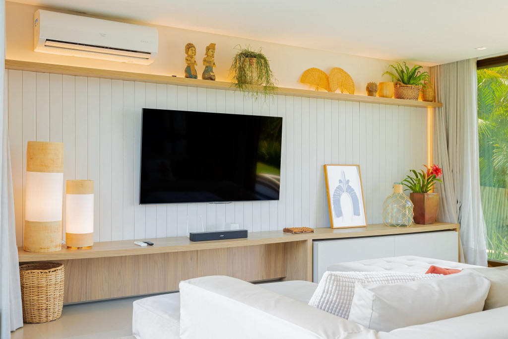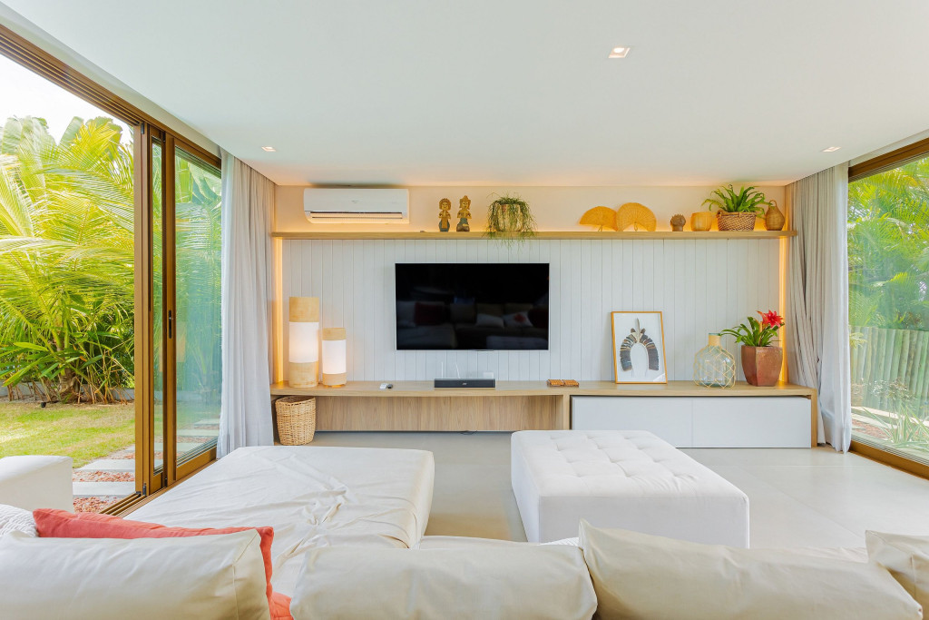 A composição dos quartos é da seguinte forma:Suíte 1 / Escritório (térreo): 1 sofá-cama, ar condicionado split, ar condicionado split, cortina blackout e armário;
